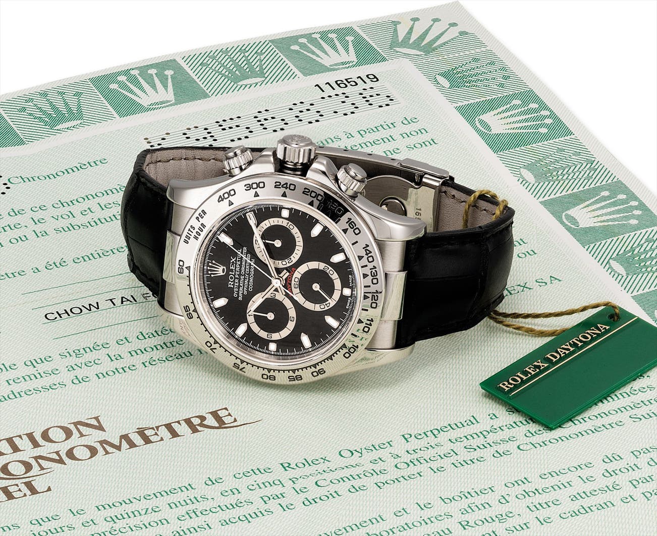 A fine white gold chronograph wristwatch with original guarantee and fitted presentation box