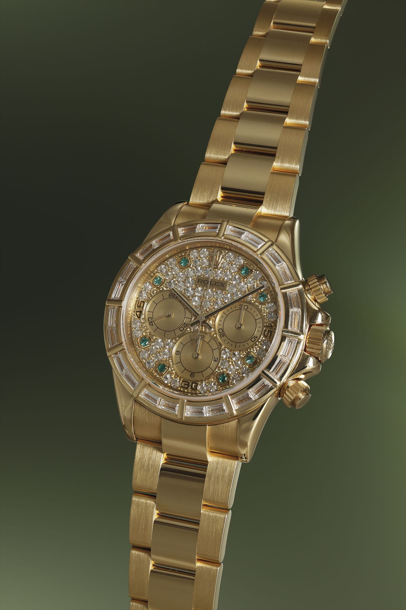 Fitted with a baguette diamond-set bezel and pavé dial, the present watch features wonderfully well-matched emeralds set in yellow gold chatons, in lieu of numerals. Rolex’s craftsmanship is second to none, and I really appreciate the level of skill required to manufacture this watch.