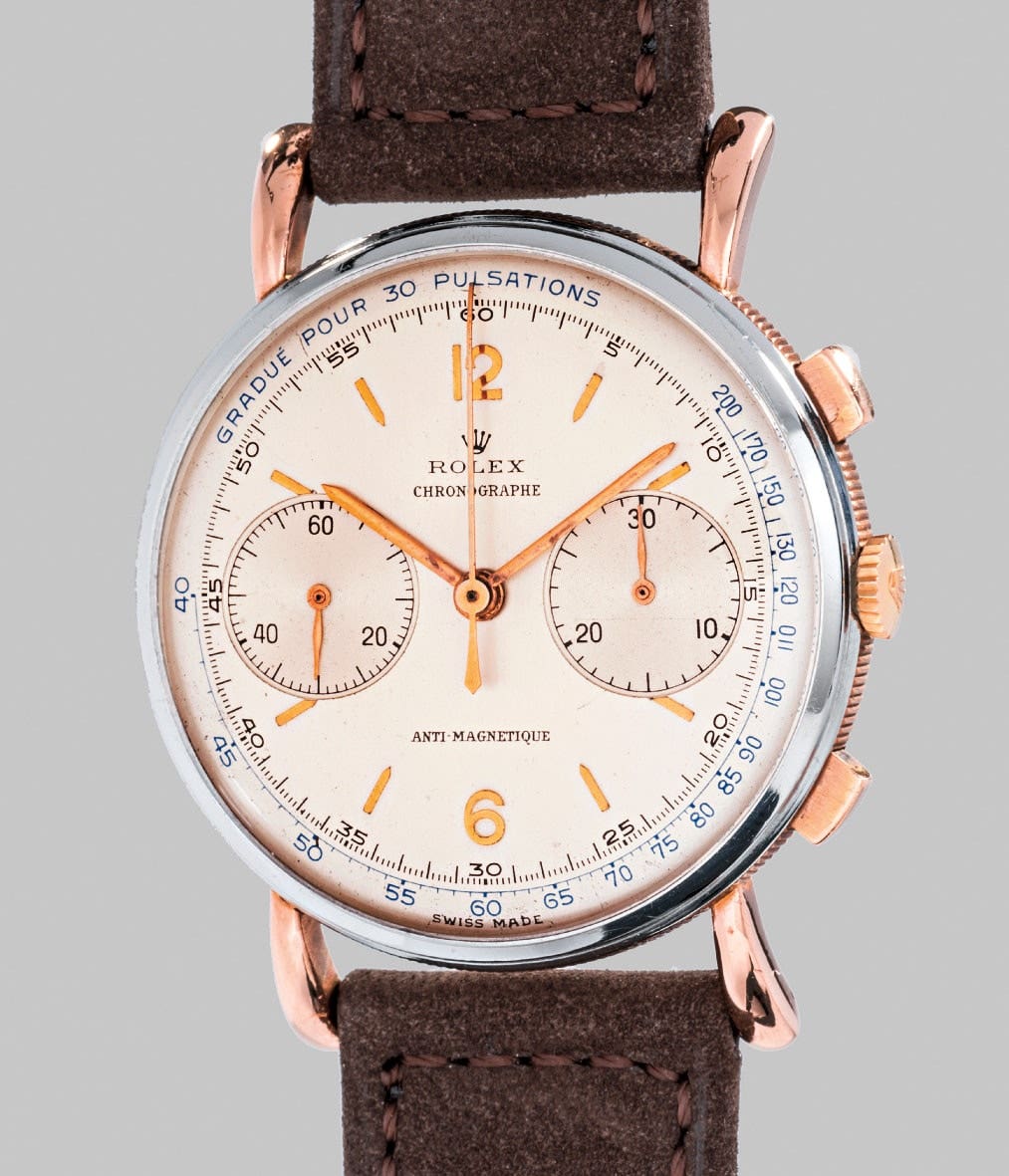 In overall excellent condition, featuring a very desirable and rare pulsation scale dial and a playful steel and pink gold case, the present lot stands out from Rolex’s traditional production and will speak to the collector looking for a vintage “dress” chronograph showing tasteful restraint and refinement.