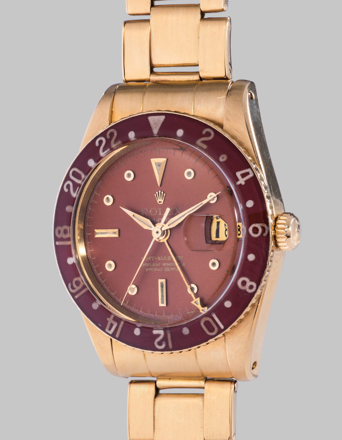 Given that the GMT-Master was created for specific, work-related purposes, most examples were cased in stainless steel. These watches were worn in the most practical sense and made to withstand the elements. Yet, Rolex also manufactured a very limited number of watches cased in yellow gold, and fitted with a brown bakelite bezel. Due to the immense fragility of these watches, it is incredibly rare to find examples fitted with a bakelite insert.