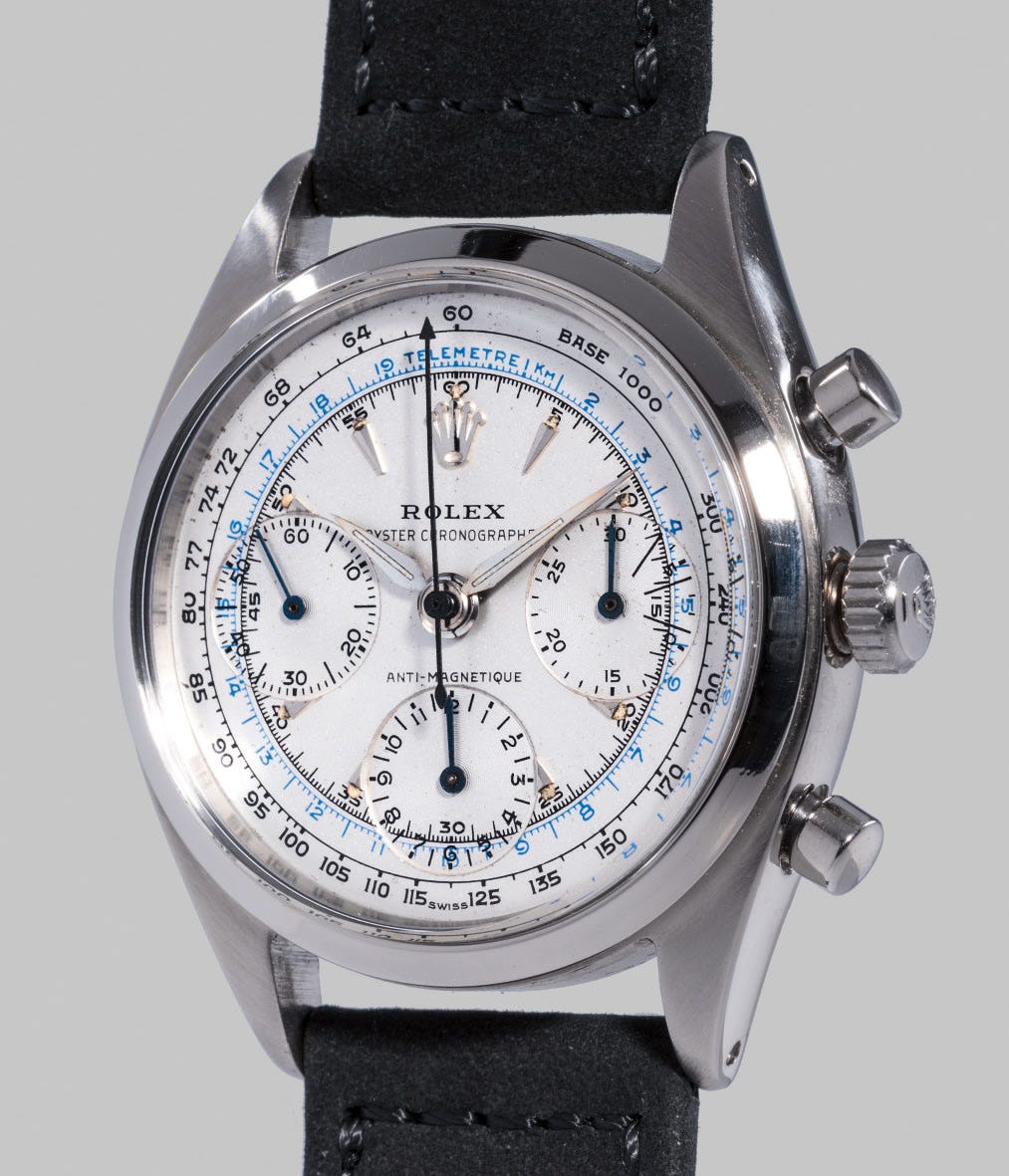 In production for a very short time, Rolex ceased production in 1961 and replaced it with the reference 6238. During this period reference 6234 was made in a variety of case metals and dials ranging from those with a matte or lacquer finish, to various subsidiary register sizes, and even contrasting tachometer/telemeter color combinations. These variations were used to gauge the market’s tastes for chronograph wristwatches.