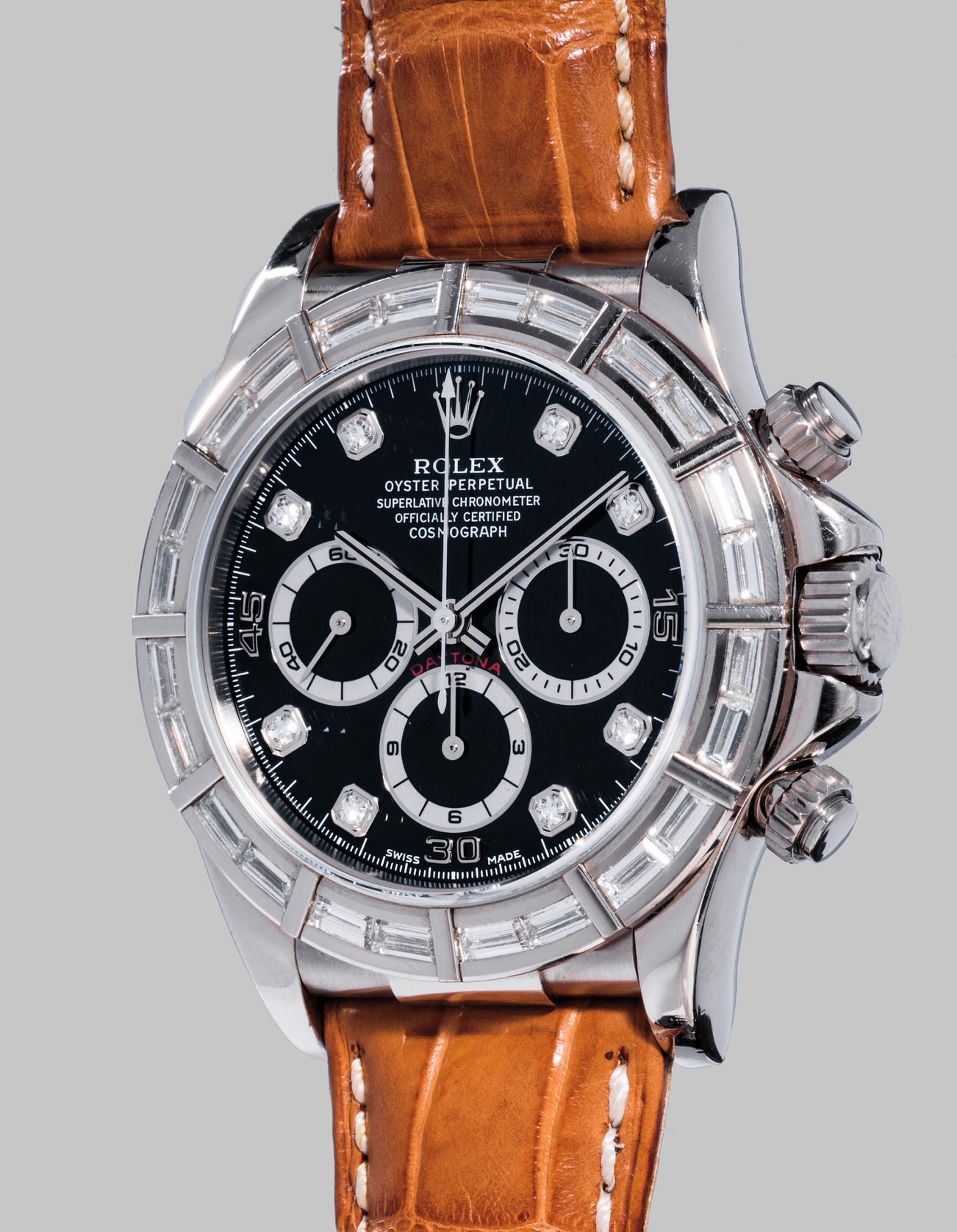 Fitted with a baguette diamond-set bezel and diamond-set numerals, the present watch combines Rolex's gift in gem-setting and creating beautiful movements. Known for their rigorous standards in quality, Rolex is particularly skilled at creating gem-set watches, whether it be a lavishly-set Day-Date, or a an eye-catching and striking SARU GMT.