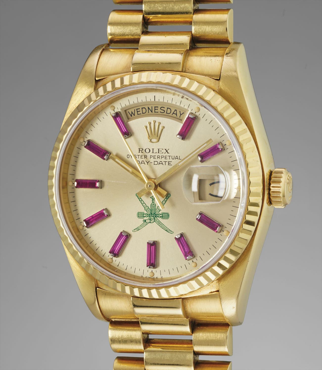 The present Day-Date is lavishly set with baguette rubies in lieu of numerals, furthermore highlighted by an enigmatic green Khanjar symbol at 6 o'clock, which is part of the national emblem of Oman. The present watch was most likely ordered upon special request by His Majesty Qaboos bin Said Al Said, the Sultan of Oman. Such special order watches were usually presented as gifts to His Majesty's closest dignitaries and staff.