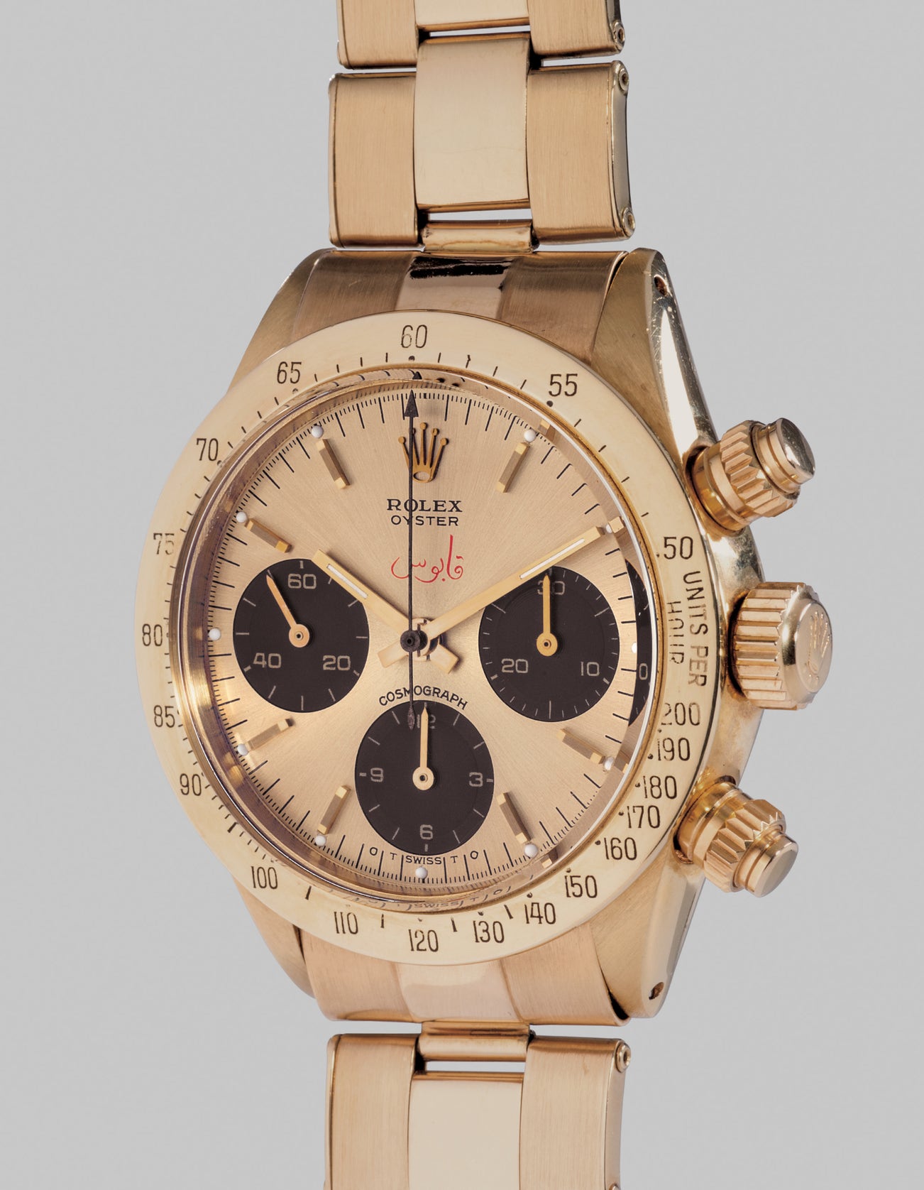 Given as gifts to foreign dignitaries and loyal staff, watches with the Qaboos signature are extremely sought after. Extensive research shows that only one example of reference 6265 in yellow gold with the red Qaboos signature is known to scholars: the present one, making it a true grail for collectors.