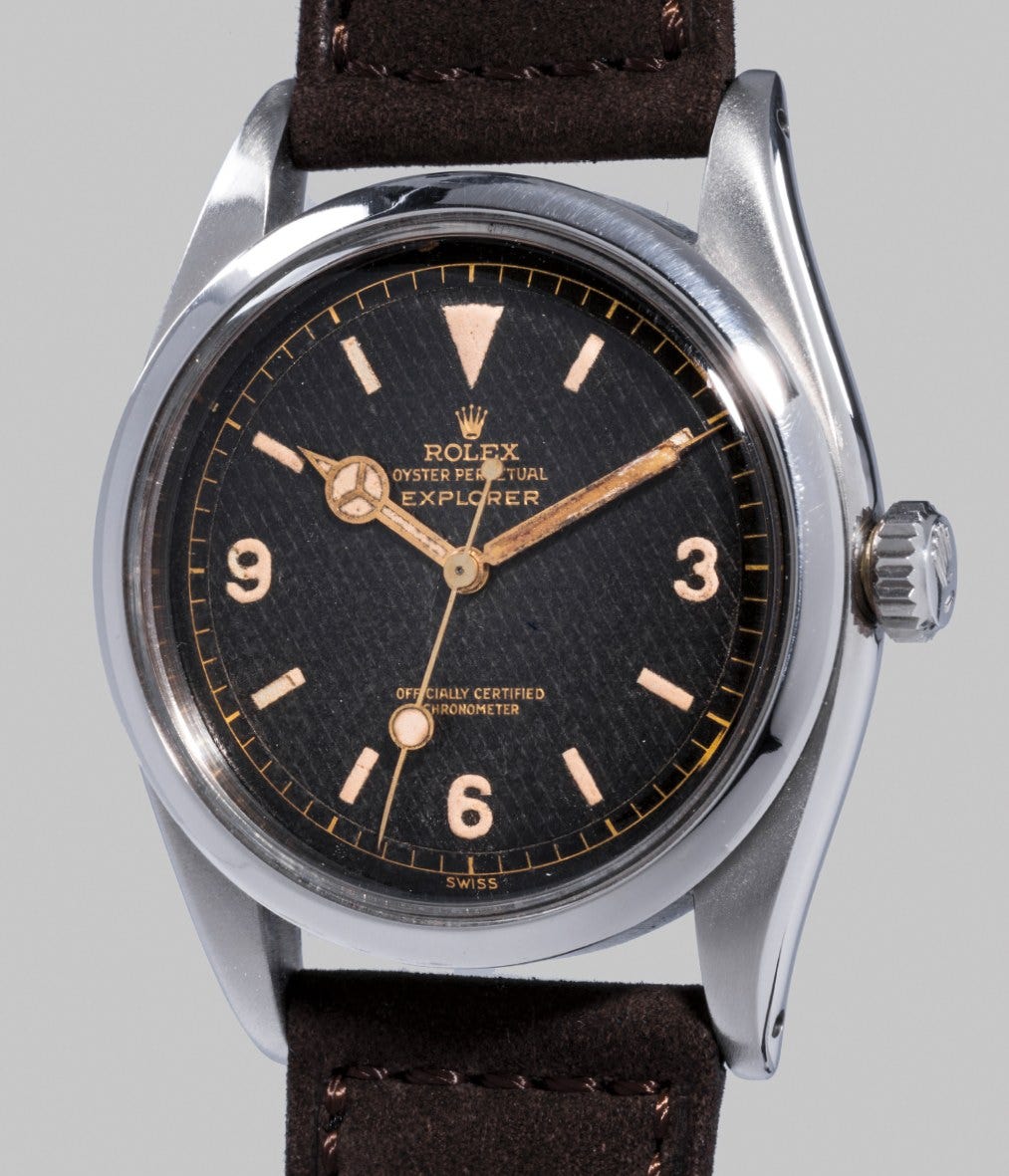 The key objective in creating the Explorer was dial legibility. Luminous material was thus applied to the dial, with the iconic '3-6-9' numerals clearly recognizable even from far away. Unlike reference 6150, which bore ‘Precision’, reference 6350 was marked ‘Officially Certified Chronometer’, confirming the movement had been subject to stricter timing tests.