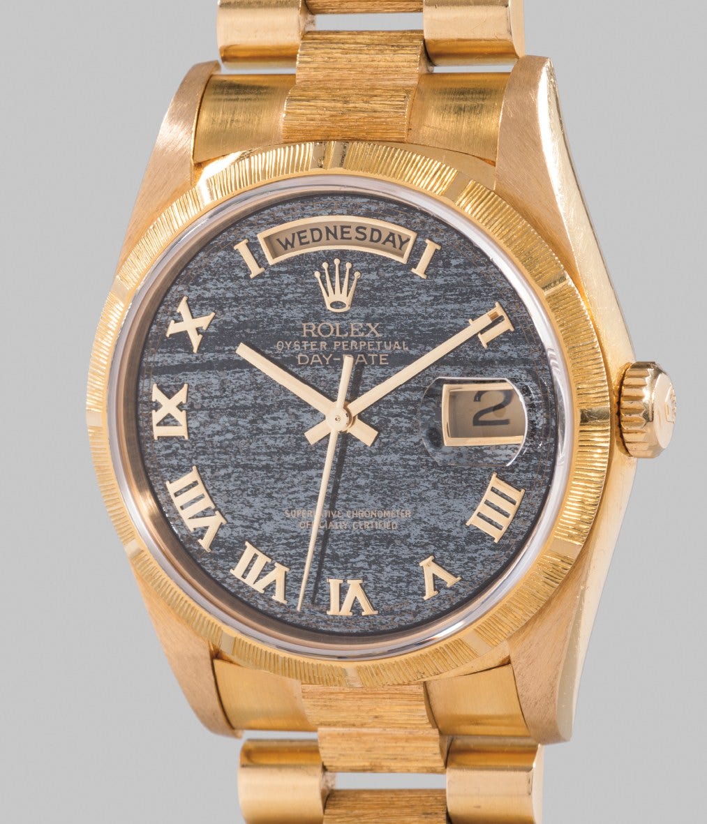 The “bark” finished bezel includes rectangular hour markers that line up perfectly with the applied Roman numerals on the dial. To balance the bezel, the Rolex President bracelet features bark-finished centre links, adding to its appeal.