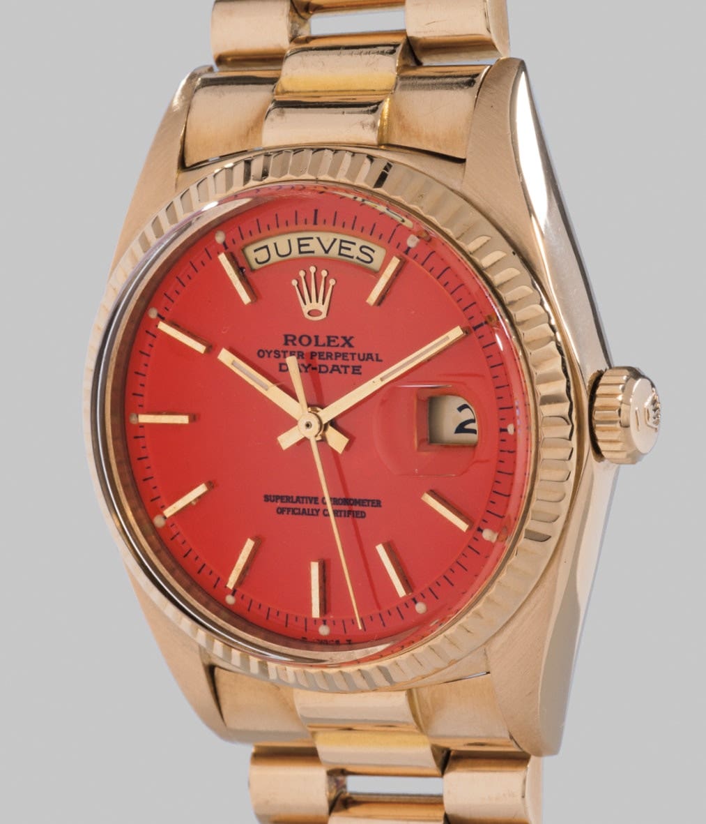 The present Day-Date, reference 1803, features a flamboyant coral 'Stella’ dial, providing an arresting contrast with the yellow gold case.