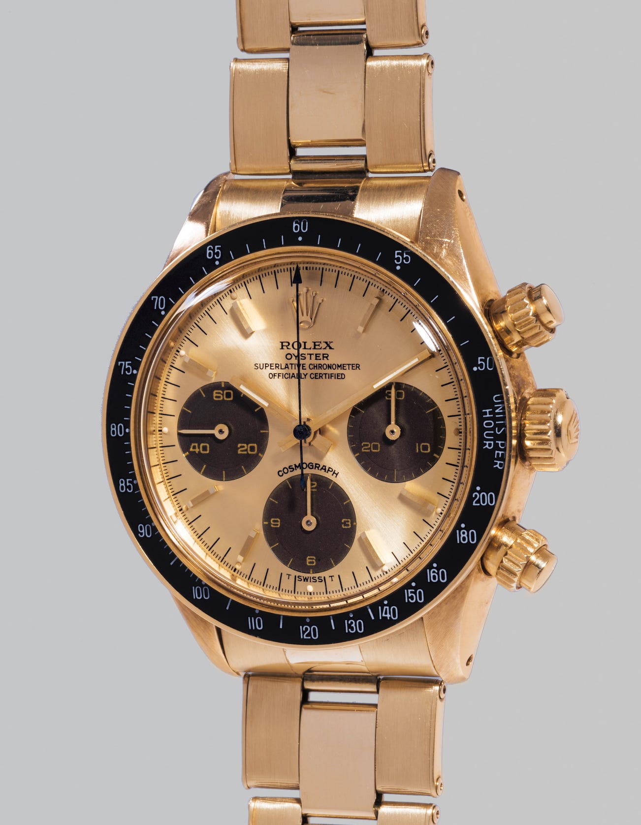 Adding to its exclusivity, this rare 6265 Oyster Cosmograph is in 14-karat gold, which was offered only in the North American market. Furthermore the typical metal bezel found on the 6265, had been replaced likely at the time of its original sale with the acrylic tachymeter bezel found on the 6263 model. The bezels for both references were easily interchangeable and fit both references, and its appearance on this example could have been the conscious decision of its new owner to make the watch look less sporty.