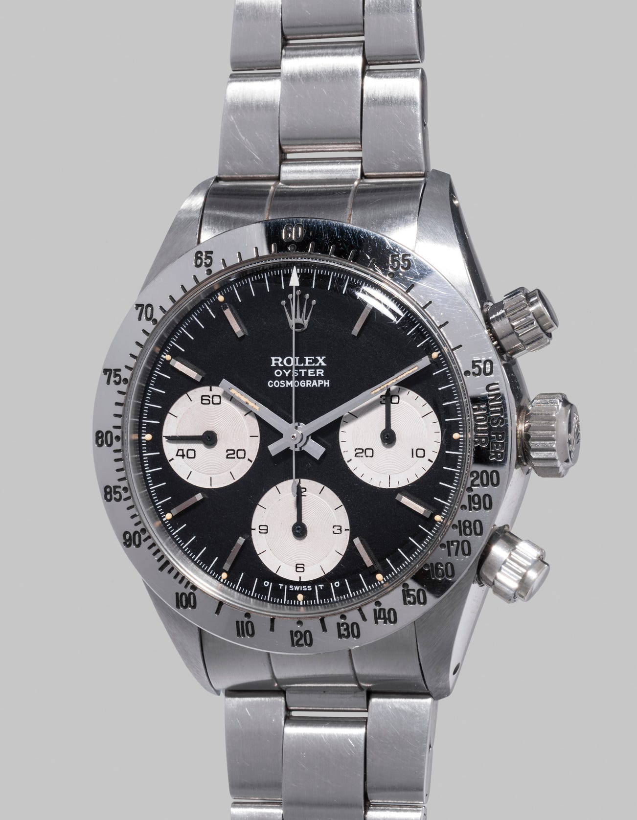 Launched in the late 1960s, references 6263 and 6265 replaced the first Oyster Cosmograph model, reference 6240. From the original owner, this chronograph is equipped with the correct Mark II pushers featuring ridges that are wider and more triangular than those found on Rolex’s earliest Daytona pushers.