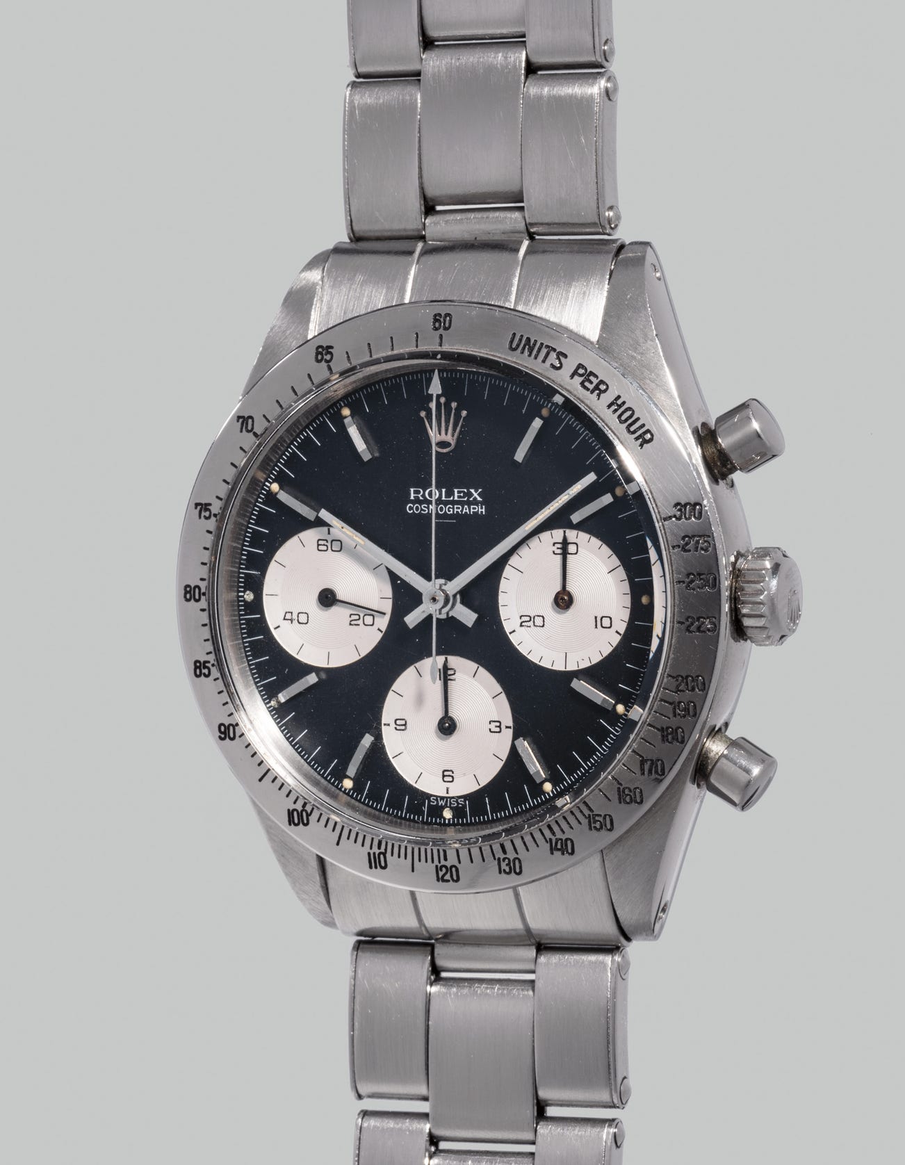 The black dial is the most compelling aspect of the watch, namely in its "Double Swiss" designation. Rolex had originally used stamps that were designed for use on previous models. Since the bezel of the new "Cosmograph" was larger, and covered the edge of the dial, Rolex had to redesign the stamps, and print "Swiss" again, this time immediately visible to the viewer. Today, this "Double Swiss" designation is very collectible, providing scholarship for the collector.