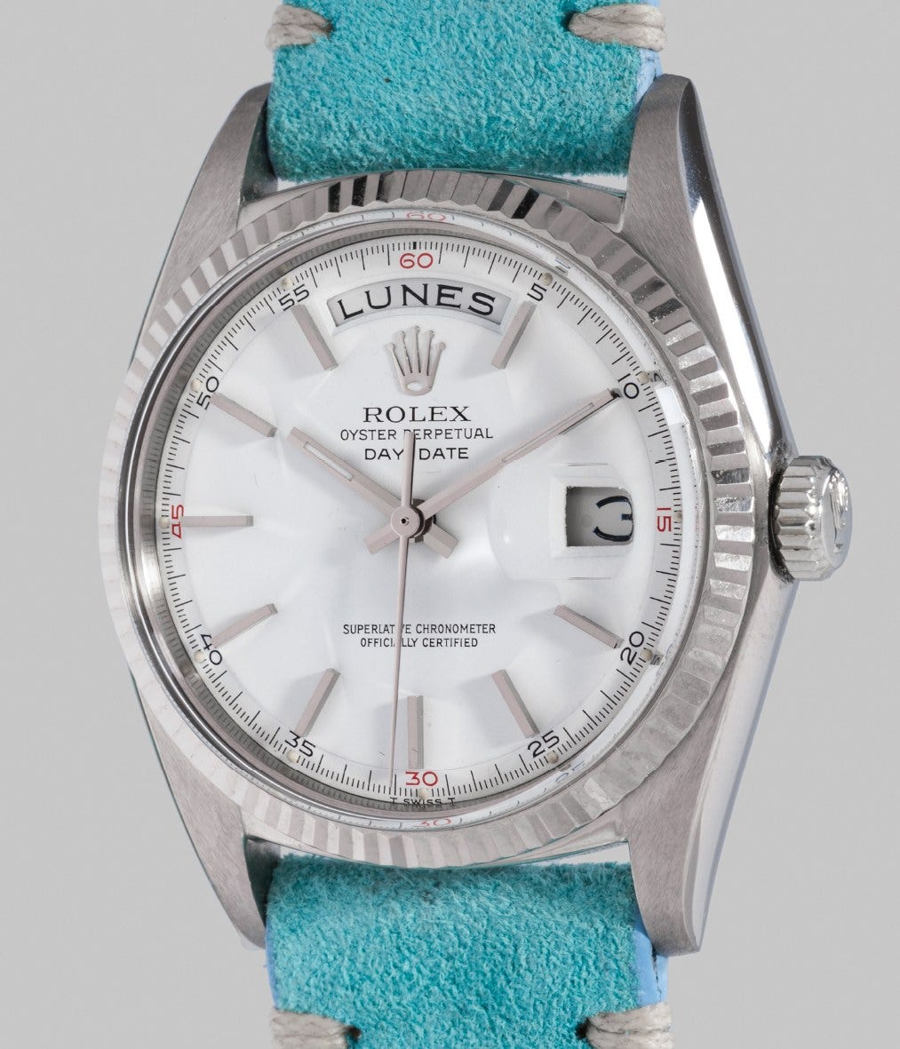 The present watch bears the reference 1803, one of the longest serving Day-Date reference. It is fitted with an incredible immaculate white dial with red quarter, and the days are indicated in Spanish. Freshly serviced by Rolex, the present watch is in excellent condition and the vivid turquoise blue strap gives it a very appealing summertime look.