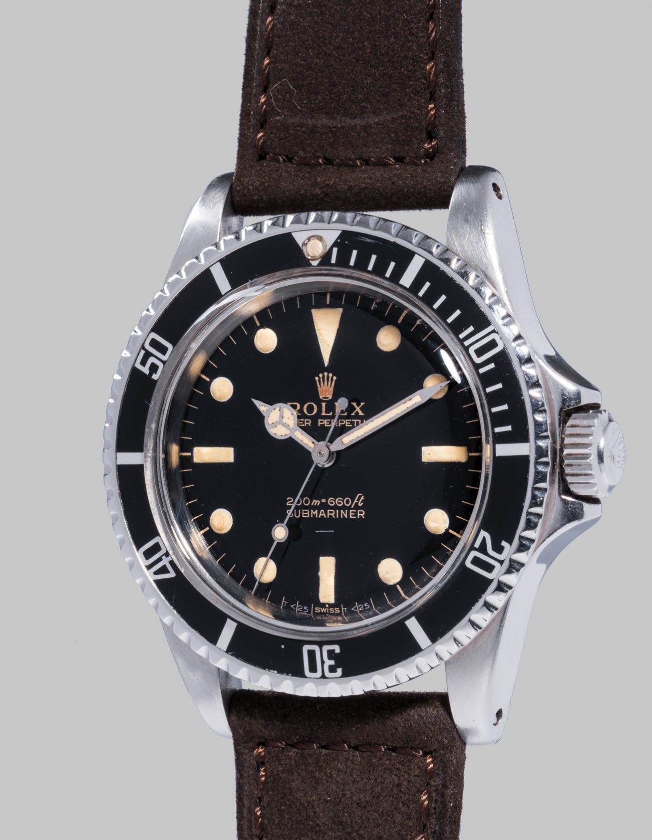 Yet, making matters even more complex and interesting, is the double "T < 25" designation in addition to the Swiss signature at 6 o'clock. This designation is most notably seen on Explorer "3-6-9" reference 5513 dials. To find one fitted with a watch featuring luminous plots is quite extraordinary. The dial most likely started its life in the earliest stages of reference 5513's production. Having remained in the manufacture's stock, it can be concluded that Rolex added the underline and "double T <25" when the firm applied tritium on top of the existing original luminous material, due to changes in watch regulation. The watch was then assembled in 1964.