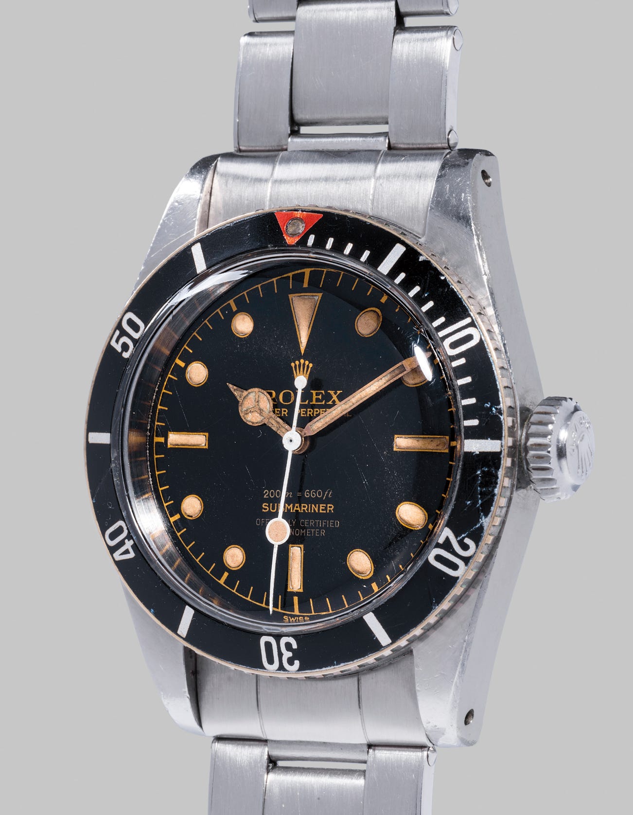 This example, manufactured in approximately 1959, was produced towards the end of the the reference's production period. Known as a "Four Liner", the dial displays "Officially Certified Chronometer", comprising two lines of text underneath the depth rating. This designation denotes that the watch is fitted with a chronometer certified movement. "Four liner" dials are especially beloved by collectors, and considered rarer and more valuable than their "two-liner" counterparts.