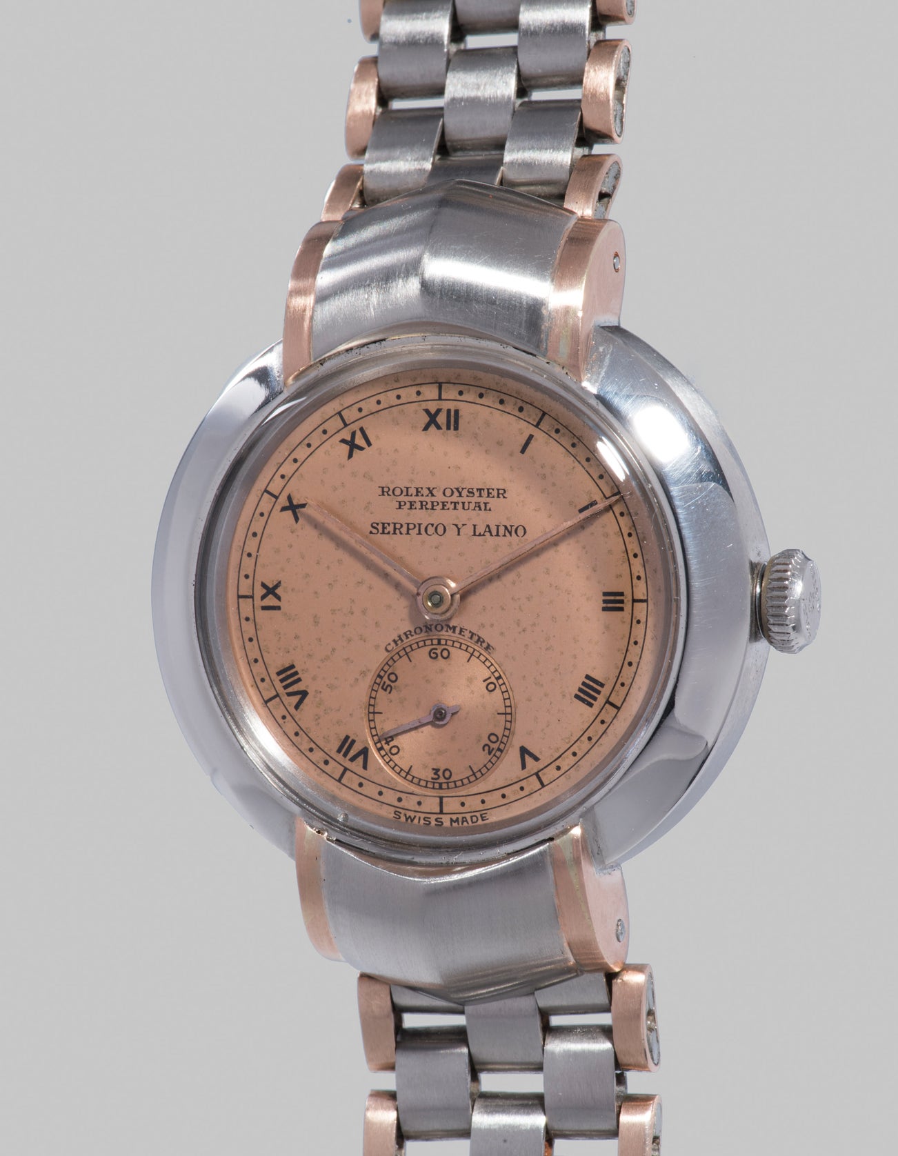 The present watch furthermore impresses with its extremely attractive stainless steel and pink gold “Grain de Riz” folded bracelet. The massive bicolor hooded lugs procures a somewhat medieval touch to the watch and fantastically contrasts with the round, smooth, mirror-finished bezel. The pink dial is of the best effect and perfectly matches the pink gold plated bracelet. The dial is further signed with the name of the prestigious South American retailer Serpico y Laino. This wonderful watch exudes the most flamboyant charisma of watch designs from the 1930s.