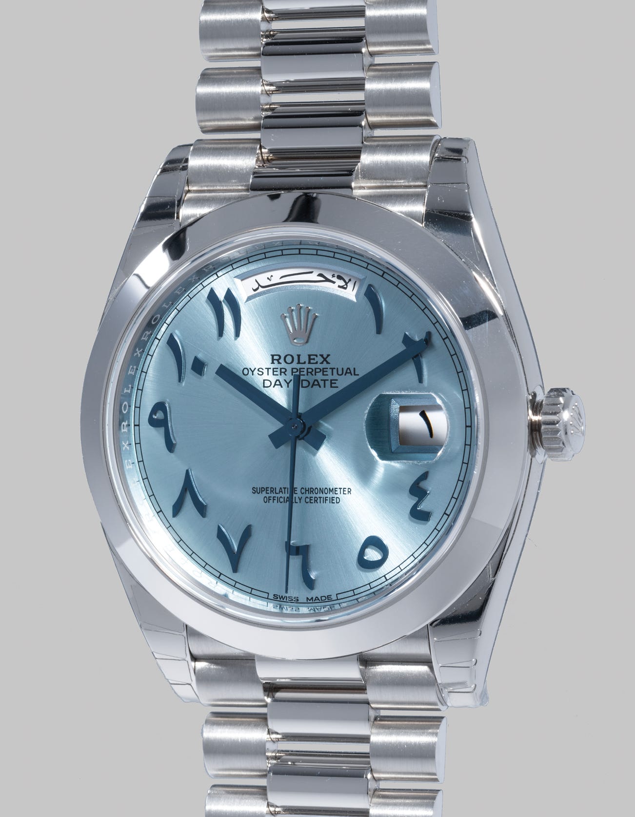 Today, Rolex continues to dazzle and surprise, with its unusual and beautifully finished watches. It cultivates and sustains its successful relationship with the Arab States by producing a multitude of special order watches for the region. The present example, produced in exceedingly limited numbers and sold only by Middle East retailers, pays homage to the dazzling Arabic Day-Dates of the 1970s, most notably in its applied Eastern Arabic numerals, which is almost identical in design to the beloved vintage Arabic Day-Dates of the past. The watch is cased in platinum, a further nod to the original Day-Dates made for the region.