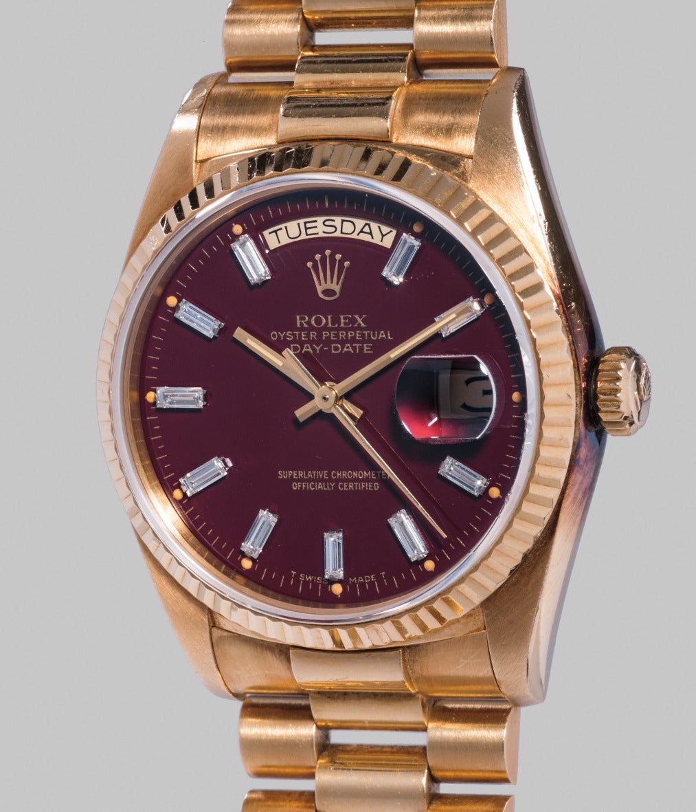 The present watch is most notably fitted with a full diamond baguette numerals and a rich burgundy and vibrant lacquer "Stella" dial. This example is among the later generation of "Stella" dials, before Rolex ceased production of the design. While some Day-Dates feature a combination of the brilliant and baguette diamonds, to have a dial set with baguettes only, is a very rare occurrence. The burgundy lacquer shines with great depth and tone, and the gold graphics are very vibrant.
