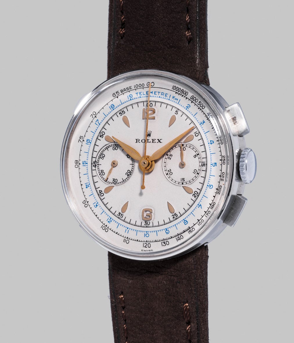 A very unusual model, reference 3233 is completely different from Rolex's usual chronograph watches, from its indented case back, to the lack of lugs and relatively smaller case size, inspiring its nickname "Moneta", and making for an elegant and unconventional watch for the Rolex collector.
