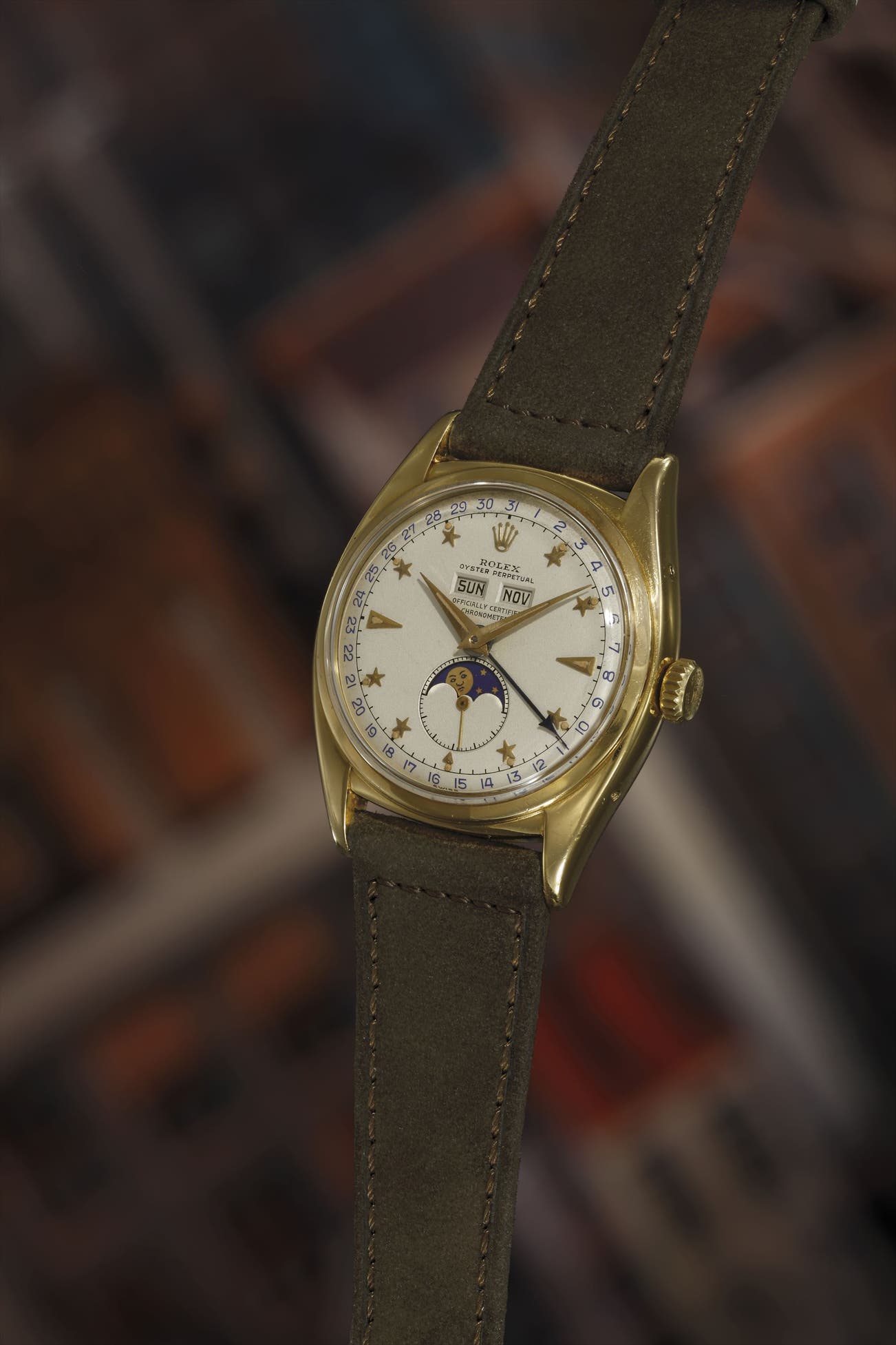 The “Stelline” is masculine and sporty, in yellow gold with the star dial, there is a cool elegance that portrays a high degree of sophistication. In excellent overall condition, the case retains its sharp hallmark, and has developed a lovely patina indicating it has spent many of its years mostly unworn. It is accompanied with a period and model correct 18-karat yellow gold Rolex Jubilee bracelet manufactured by Gay Frères, which further enhances its appeal. The present example, in its original, unrestored state of preservation, is a wonderful addition to any collection of distinction. And, indeed, an opportunity that the most demanding and educated collectors of vintage wristwatches should not miss.