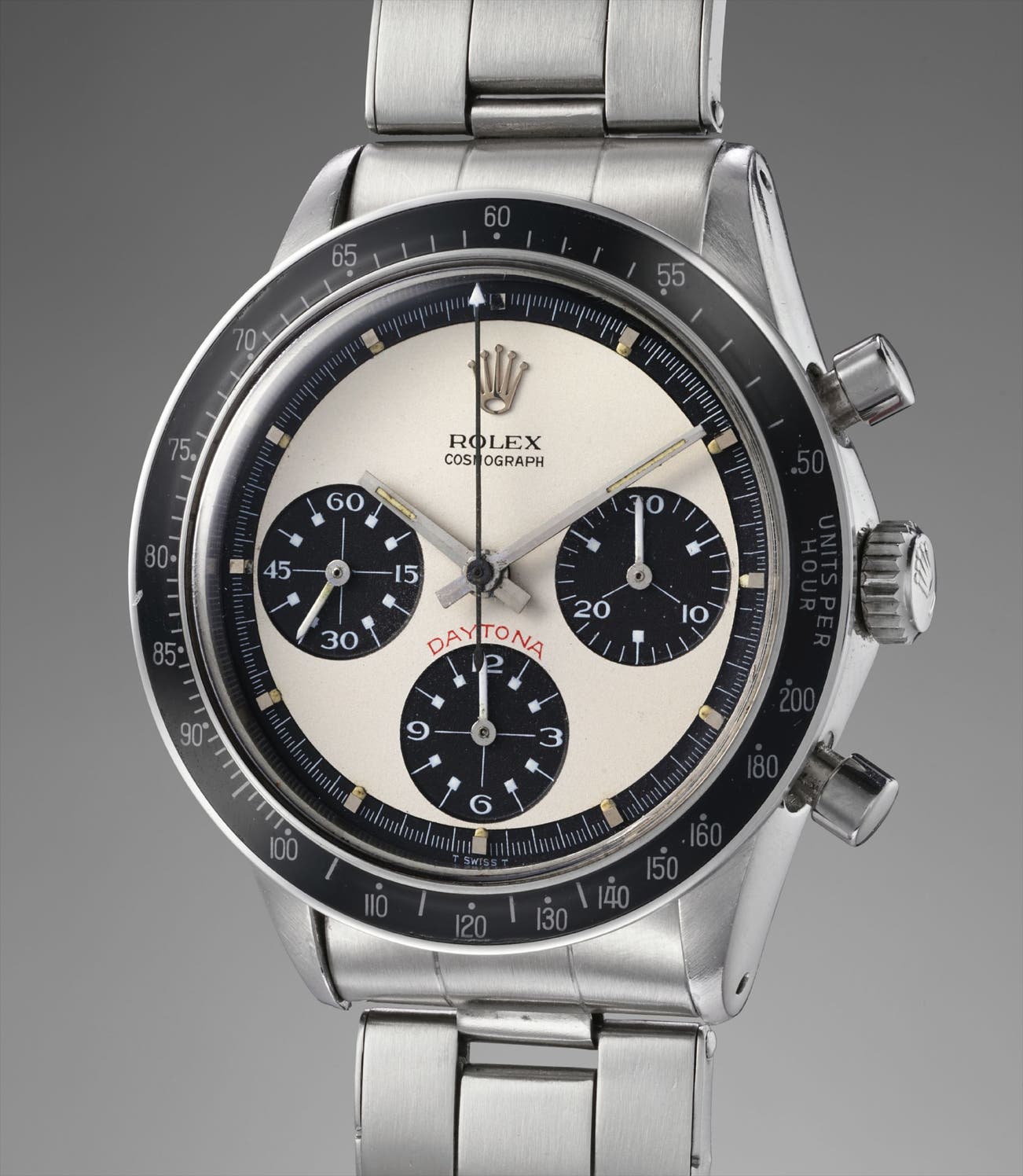 The present watch is fitted with an beautiful "Paul Newman" dial, which is instantly recognizable due to its deco-style numerals within the subregisters. While Paul Newman himself donned an exotic dial reference 6239, his name is forever synonymous with exotic dialed Cosmograph wristwatches.