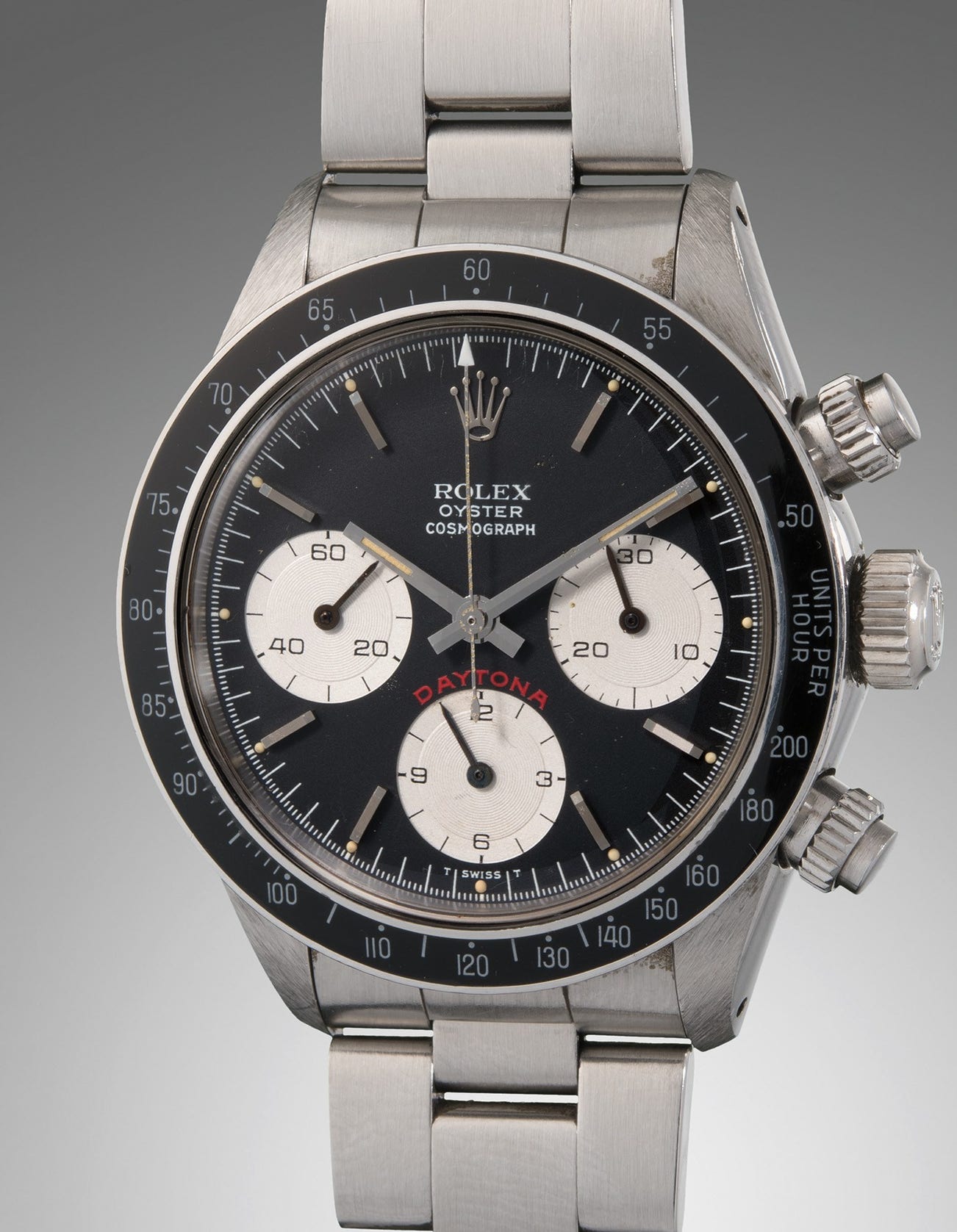 The present watch is in extraordinary original condition and has a sporty appeal with its multi-colored dial with black matte background, off-white subsidiary dials and red “Daytona” signature at 6 o’clock. The allure of the watch is enhanced with the correct black acrylic bezel, original pushers and Oyster bracelet, complete with original dated guarantee and presentation box. Certain models from a brand often standout more than others, and the Rolex Daytona today is certainly an important watch for collectors. This fine reference 6263 is an excellent example, and will please any savvy connoisseur.