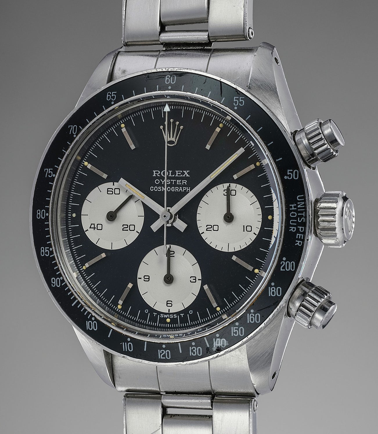 This reference 6263 is characterized by its unmistakably very good condition. Still retaining its Mk 1 bezel and Mk 2 pushers, the case displays extremely sharp edges. Although it displays signs of being worn, it has survived gracefully throughout the years and still showcases incredibly robust proportions. The lug holes are remarkably crisp and remain a substantial distance from the edge of the case. Most notably, the "Sigma" dial does not display any signs of spotting to the naked eye and all the luminous dots remain intact - an incredible feat, as many surviving Cosmographs display losses to the luminous material. Furthermore, the numbers between the lugs are incredibly deep, as they have not seen any intervention at all.