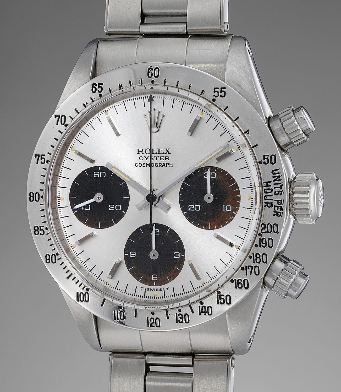 Displaying a dial that has toned down to a rich tobacco tone, this reference 6265 is preserved in excellent condition. While each subsidiary register has aged slightly differently, it gives the watch a very charismatic, singular and unmistakably honest appearance. Still retaining its original Mk 2 pushers, the case is crisp and sharp. As with early generation reference 6265s, the inside case back displays 6262 as Rolex used leftover casebacks from earlier Cosmographs.