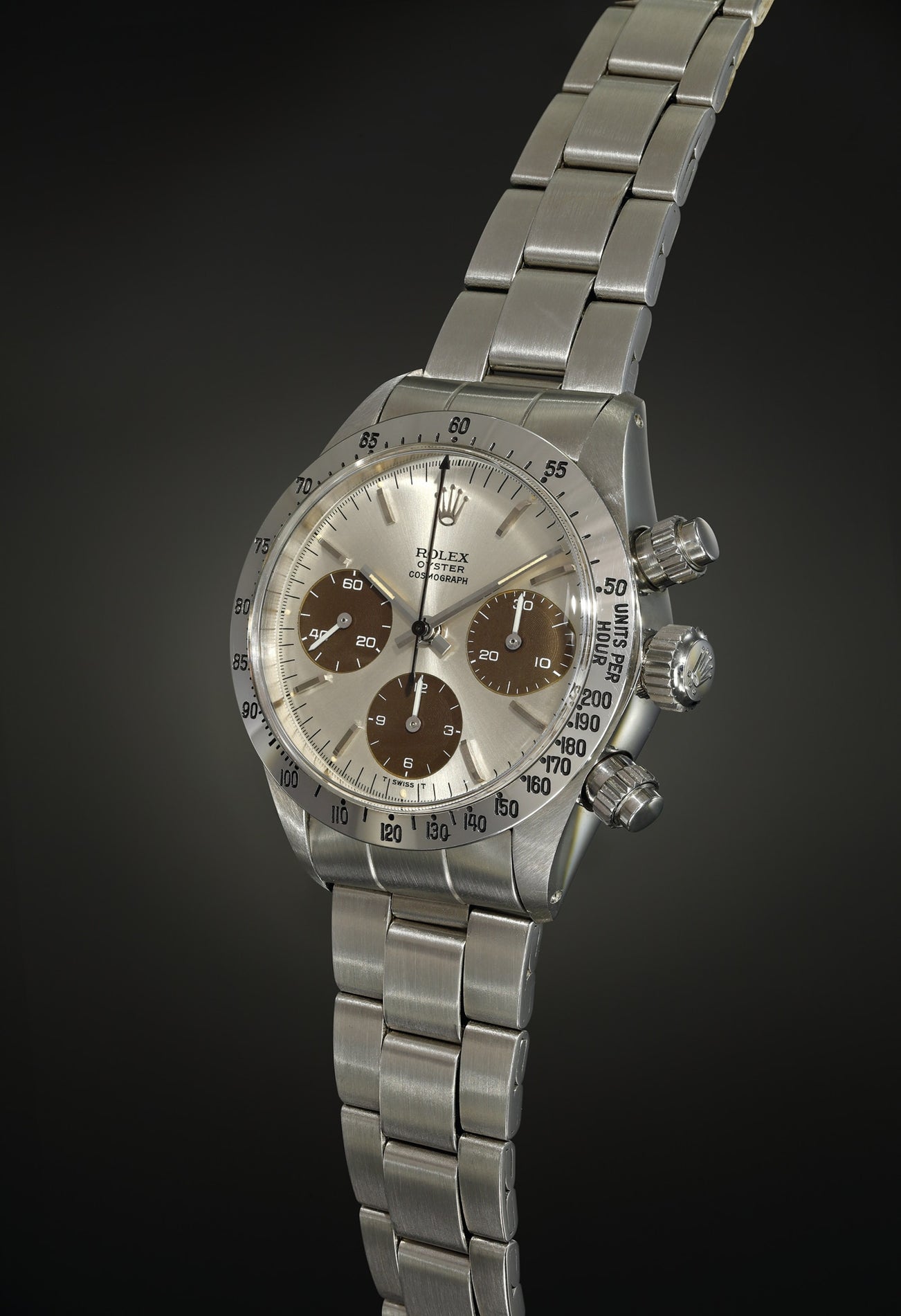 An extraordinarily well-preserved stainless steel chronograph wristwatch with silvered dial displaying chocolate ‘tropical’ registers and bracelet.