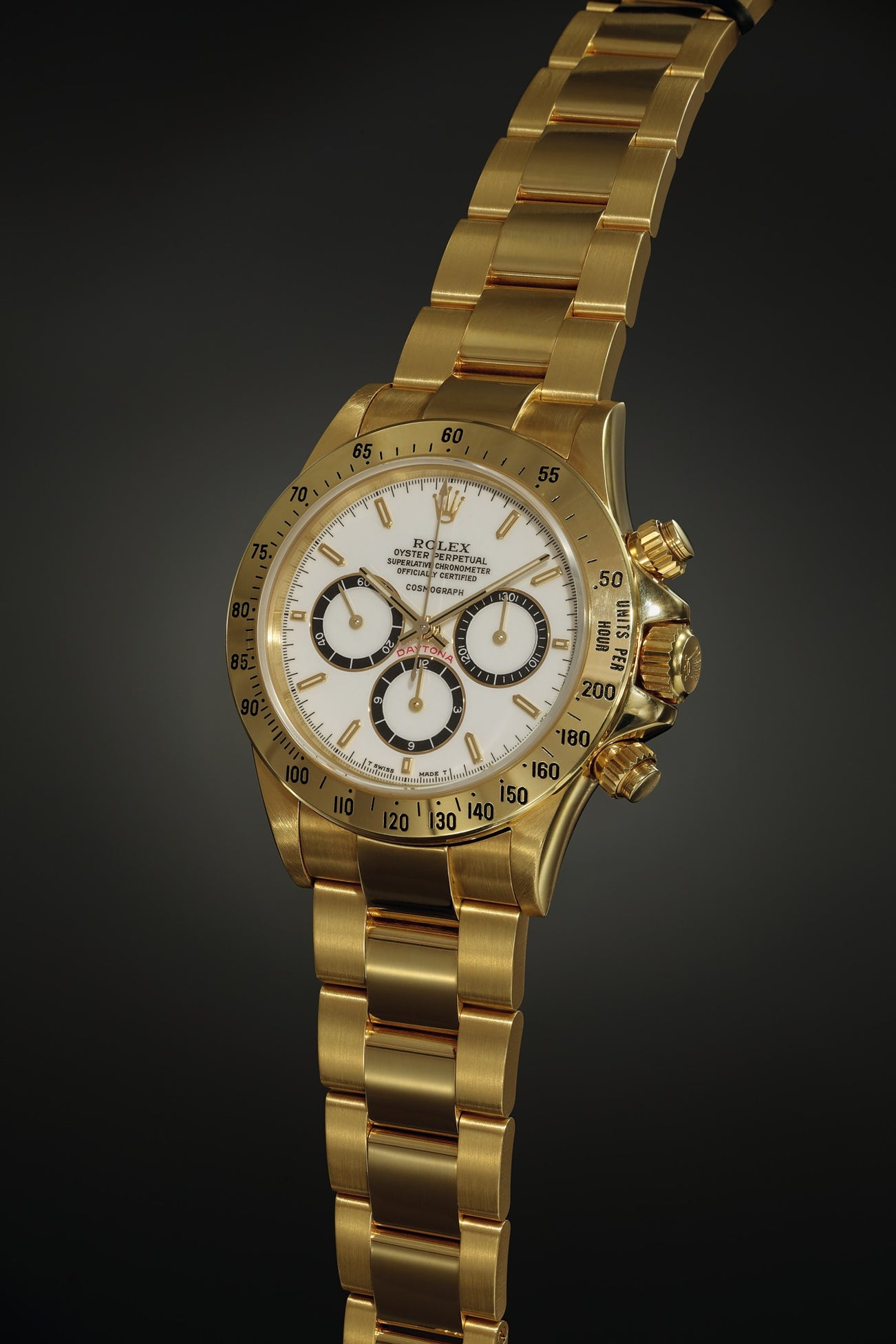 This timepiece is fitted with an original early bezel, which is calibrated to 200 units. Still featuring the original case back sticker and exhibiting full proportions, the watch retains all its original accessories, such as the punched guarantee stating it was sold in Gstaad – a fitting location to don a luxurious and rare Cosmograph Daytona. It is also offered with a numbered sales tag and fitted presentation box.