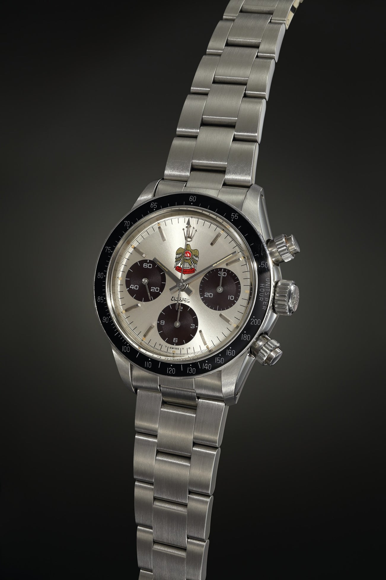 An exceptionally rare stainless steel chronograph wristwatch with UAE Quraysh Hawk dial and cocoa registers, made for Mohammed bin Rashid Al Maktoum