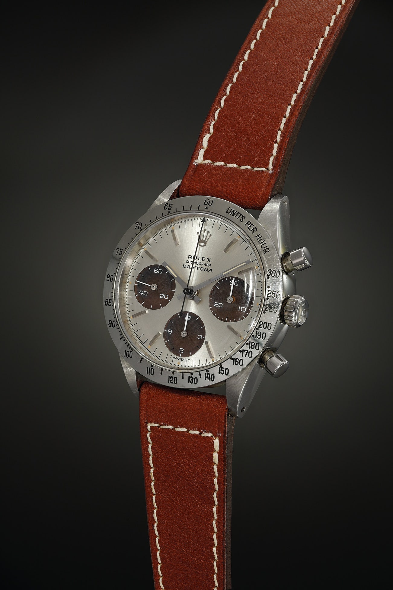 Furthermore, the subsidiary registers have aged to a particularly even and stunning tobacco brown tone, contrasting against the bold and unblemished white graphics.The dial also displays luminous dots that have aged with light patina.