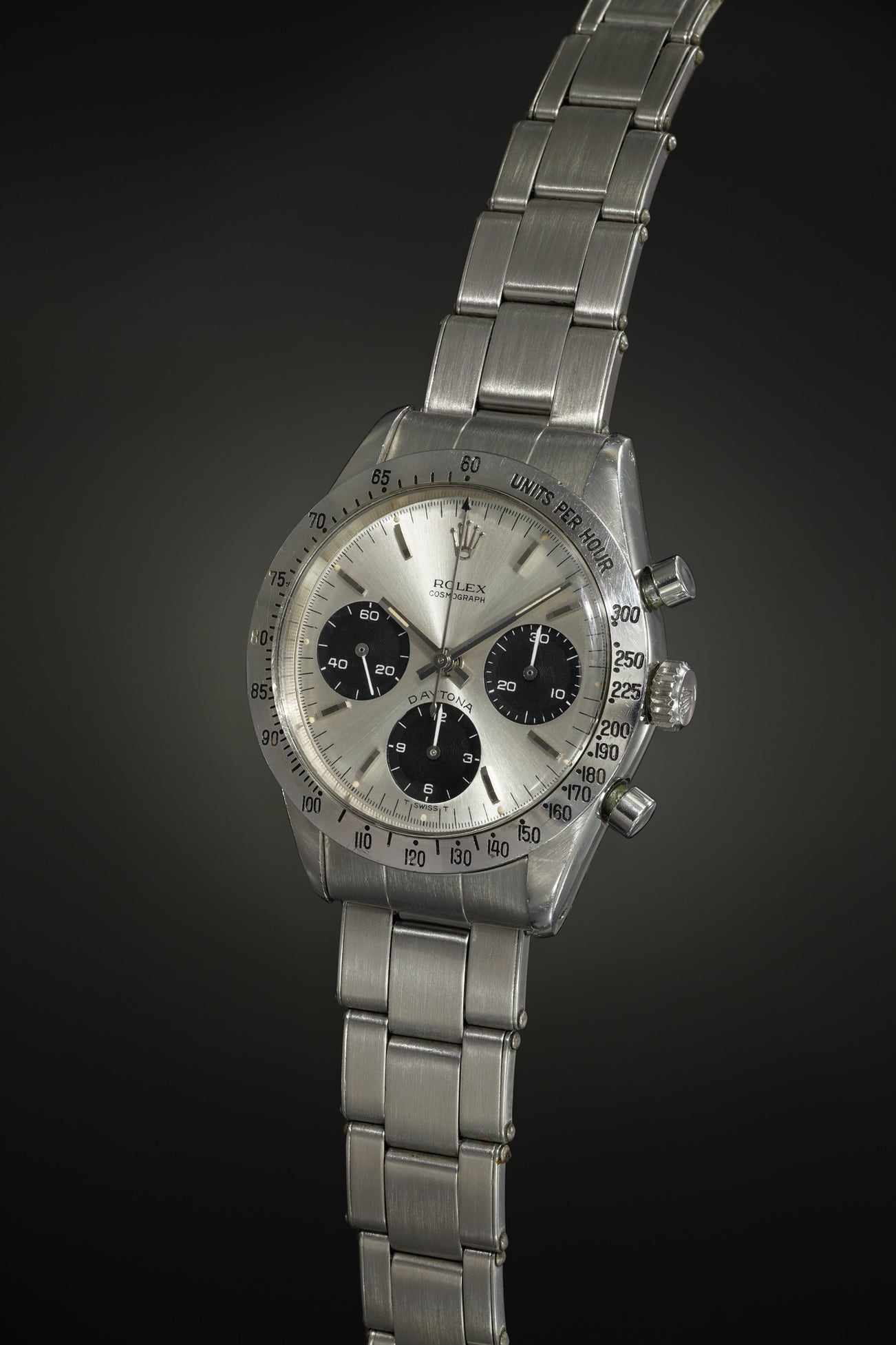 Featuring a small “R” in “Rolex” and unequal spacing between the letters “D” and “A” in “Daytona”, this early silvered soleil dial graphically recalls the rare typology printed in red, known to collectors as the “Cherry Logo”. However, what really distinguishes this dial version is the black color of “Daytona”, making this dial configuration like no other. While subtler than its already-rare scarlet sibling, it is to the best of our knowledge, one of very few examples that has surfaced on the market so far.