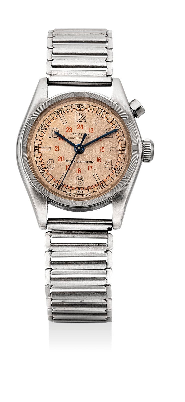 The dial of this timepiece is as enthralling as its historical and technical features: it can be considered a hybrid of many styles, borrowing elements from art deco dials (the dot minute divisions on metallic pink track), 1940s dials (the railway fifth of a second combined with Arabic five minutes divisions), and professional timepieces (the additional red 12 - 24 hour ring in the center). Such an unusual design can be deemed a first effort toward the development of a “professional” dial layout, a field into which Rolex is destined to excel in a couple of decades.