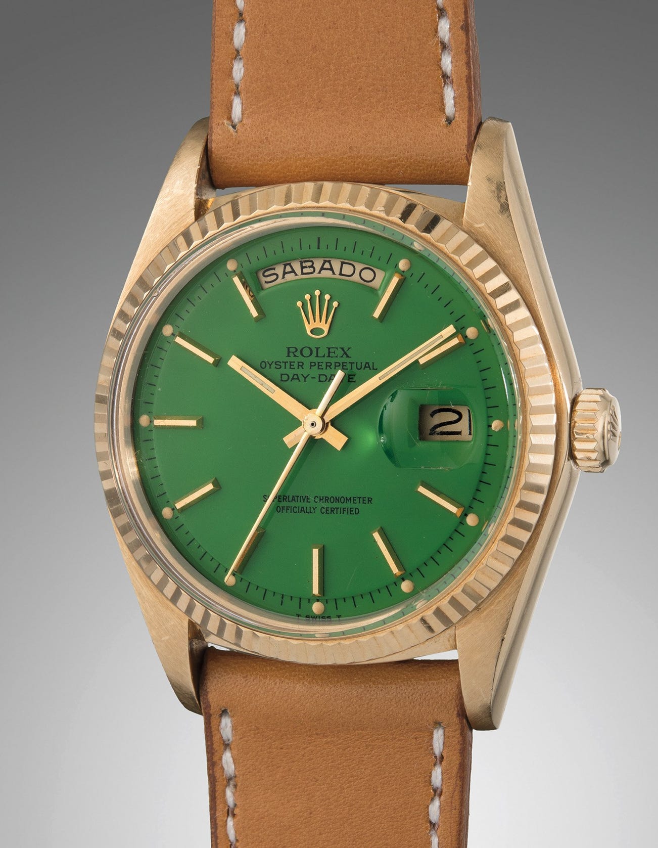 This green "Stella" Day-Date is preserved in remarkable condition. The dial is pristine, and the lacquer exhibits an exquisitely rich leafy green tone. The luminous hour markers have aged evenly with the hands taking on a warm yellow patina, and each luminous dot is perfectly preserved. Most impressive are the edges around the day and date apertures, as the lacquer is smoothly and precisely applied, attesting to Rolex's stringent standards in quality.