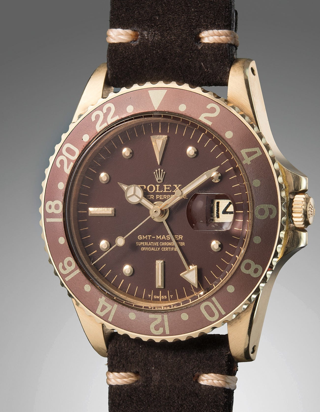 The example presented is remarkable for its exceptional state of preservation. Still retaining its original caseback sticker and showing signs of hardly ever being worn, it offers more than just a gold case. Its beautifully aged brown bezel and nipple dial– now turning the color of a full-bodied red wine– applied Rolex coronet, and sparkling gold lettering give this model substantial depth to its beauty. The untouched case and matching luminous further enhance the watch’s appeal. The rich tones of the gold and brown, developed over decades, provide the wearer a glimpse into the golden era of travel. A handsome example, this GMT-Master ticks all the boxes for both the casual and serious collector with its distinguished gold case, beautiful dial, and outstanding condition. It will bring years of pleasure to its next owner.