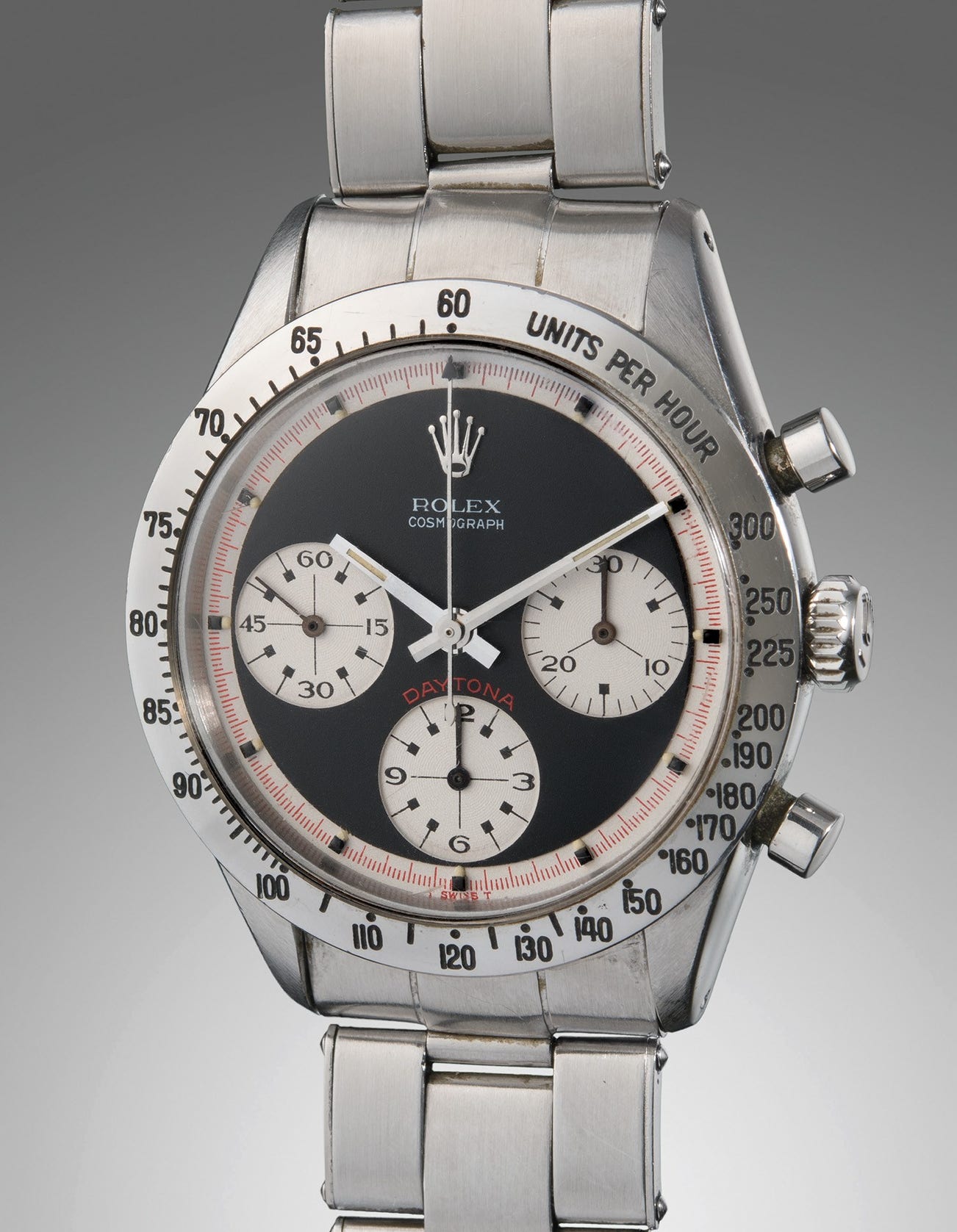 The present watch is a stunning example, maintaining its lovely original “Paul Newman” exotic dial in virtually flawless condition housed in a likely unpolished case showing hardly any signs of wear. The black grèné dial with white subsidiary dials, coupled with the bright red of the “Daytona” text at 6 o’clock, form a strikingly beautiful aesthetic. The outer red 1/5th seconds track and Art Deco style font displayed in the subsidiary dials, with well-preserved concentric circles, further enhance the depth of this watch’s beauty. The perfectly preserved luminous plots have begun to take on a pleasing and consistent warm yellow hue. This one-owner “Paul Newman” Daytona is certain to delight the most discerning collector.