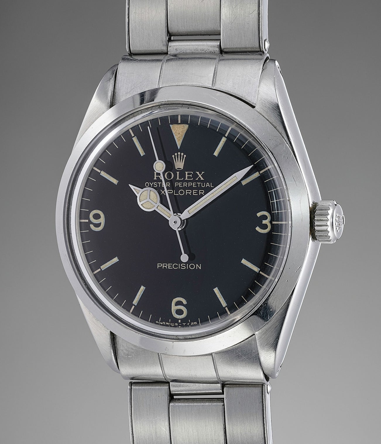 A rare stainless steel wristwatch with center seconds, black lacquer "Explorer" dial and bracelet