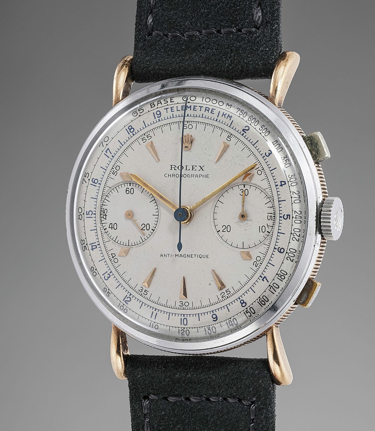 A fine and rare pink gold and stainless steel chronograph wristwatch with tear-drop lugs