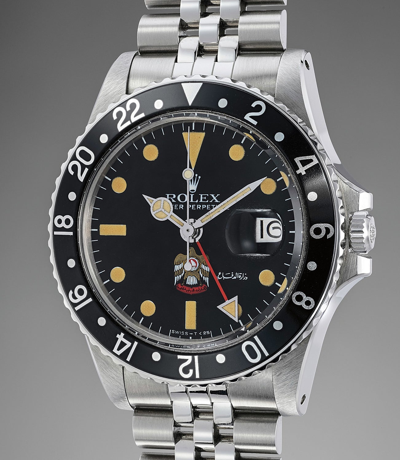 The most obvious element is of course the presence of the UAE Quraysh Hawk in polychrome on the lower section of the dial. Made upon special request for Mohammed bin Rashid Al Maktoum, Emir of Dubai, the present watch is part of an exceedingly rare batch of GMT-Masters produced between 1971 and 1979 for the Department of Defense whose signature is placed on the right hand side of the hawk. Research shows that these watches were most likely given to helicopter pilots in the Ministry of Defense.