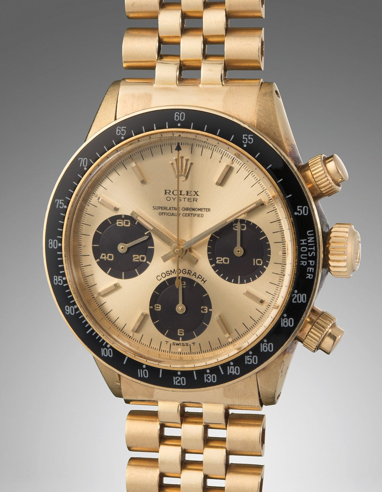Rolex decided to obtain chronometer certification for all gold Daytona models beginning in the early 1970s, and began printing ‘Superlative Chronometer Officially Certified’ on the dials, while some early examples retained the previously used “3 liner” variation. One of the rarest variants is the present example, with the dial displaying Superlative Chronometer Officially Certified floating beneath “Rolex Oyster” at 12 o’clock, giving way to its name “Oyster-Split”.