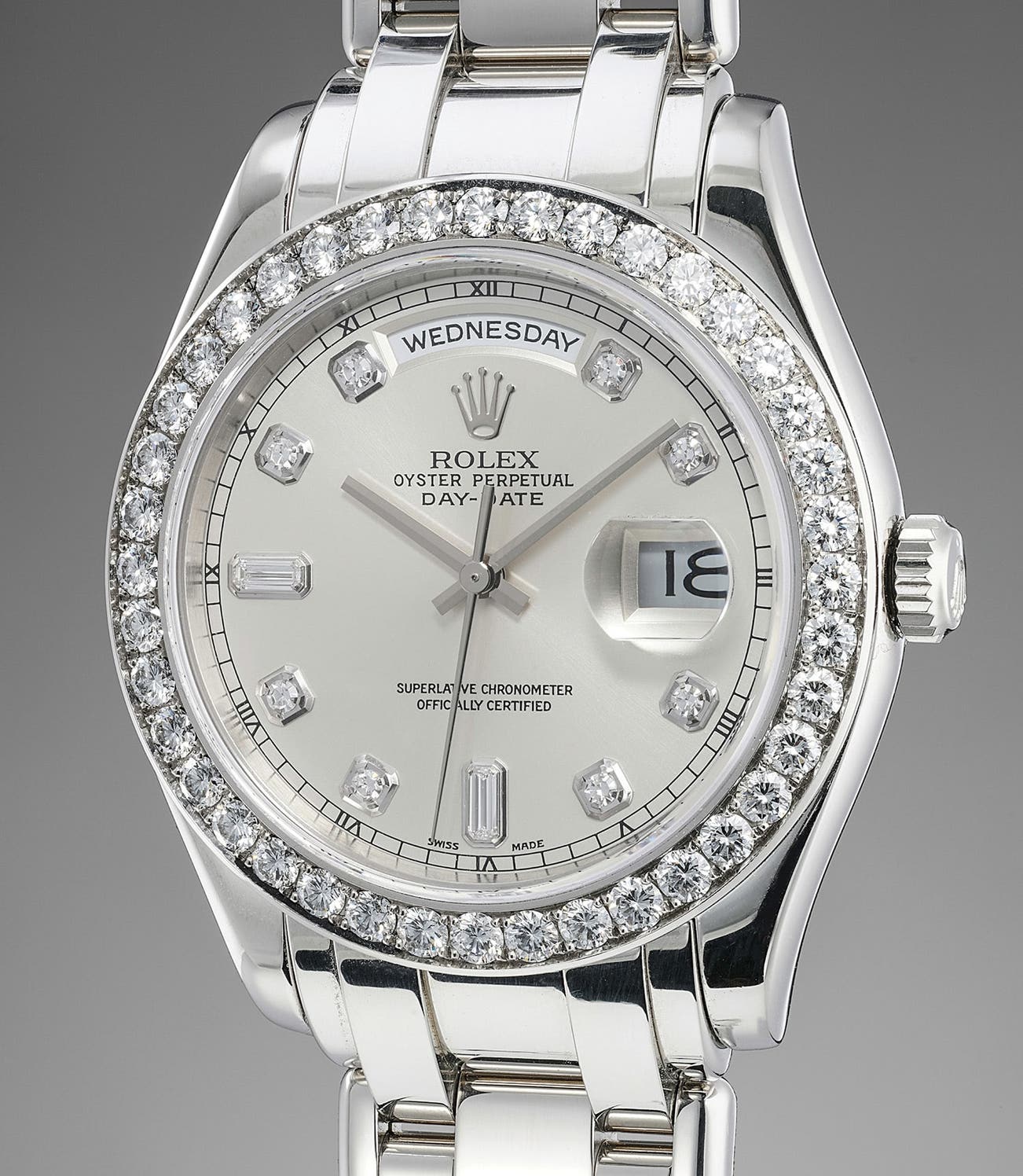 The present piece can be considered the culmination of this philosophy. Not only does it feature the most noble case metal of them all - platinum - but furthermore both the indexes and the bezel as well are adorned with diamonds. Such a luxurious combination is however so well executed and the overall design so balanced that the watch does not appear excessive or encumbered in its design. It maintains a very distinguished elegance, the diamond-setting becoming a whimsical but organic element of the composition rather than a flamboyant and encumbering detail. A true "must-have" piece for the collector of Rolex wristwatches.