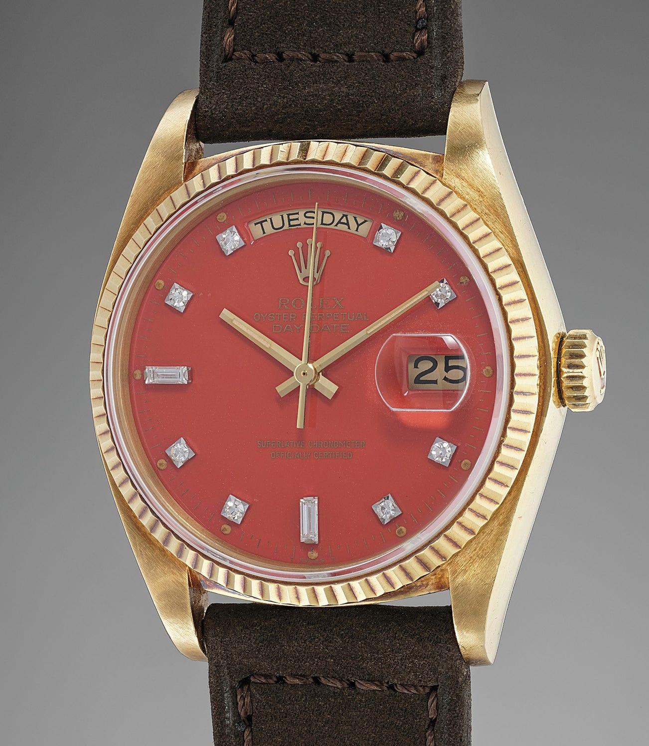A rare and extremely well-preserved yellow gold calendar wristwatch with red lacquer "Stella" dial, numbered sales tag, original guarantee and presentation box
