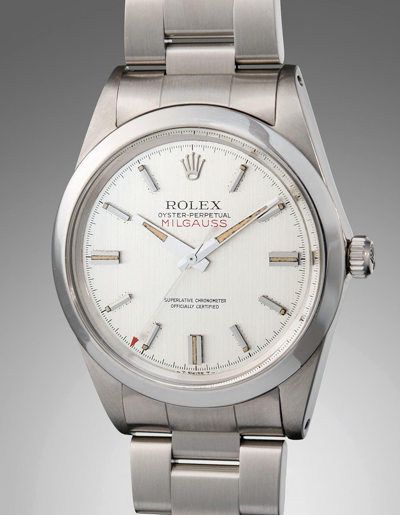 The reference 1019, likes its predecessors, featured a soft iron cage surrounding the movement. The new model was thinner and produced in stainless steel only. It remained in production until 1990. The present example is well-preserved and checks all the boxes savvy collectors look for in vintage timepieces. The unpolished case has strong proportions and sharp clean lines with a smooth polished bezel. The silvered dial has luminous plots and luminous dashes at the 3-6-9, with the model name boldly printed in red below the Rolex signature. The present wristwatch has a sophisticated mid-century modern aesthetic and when compared to better known Rolex “tool” watches, offers great value while being a pleasure to wear.