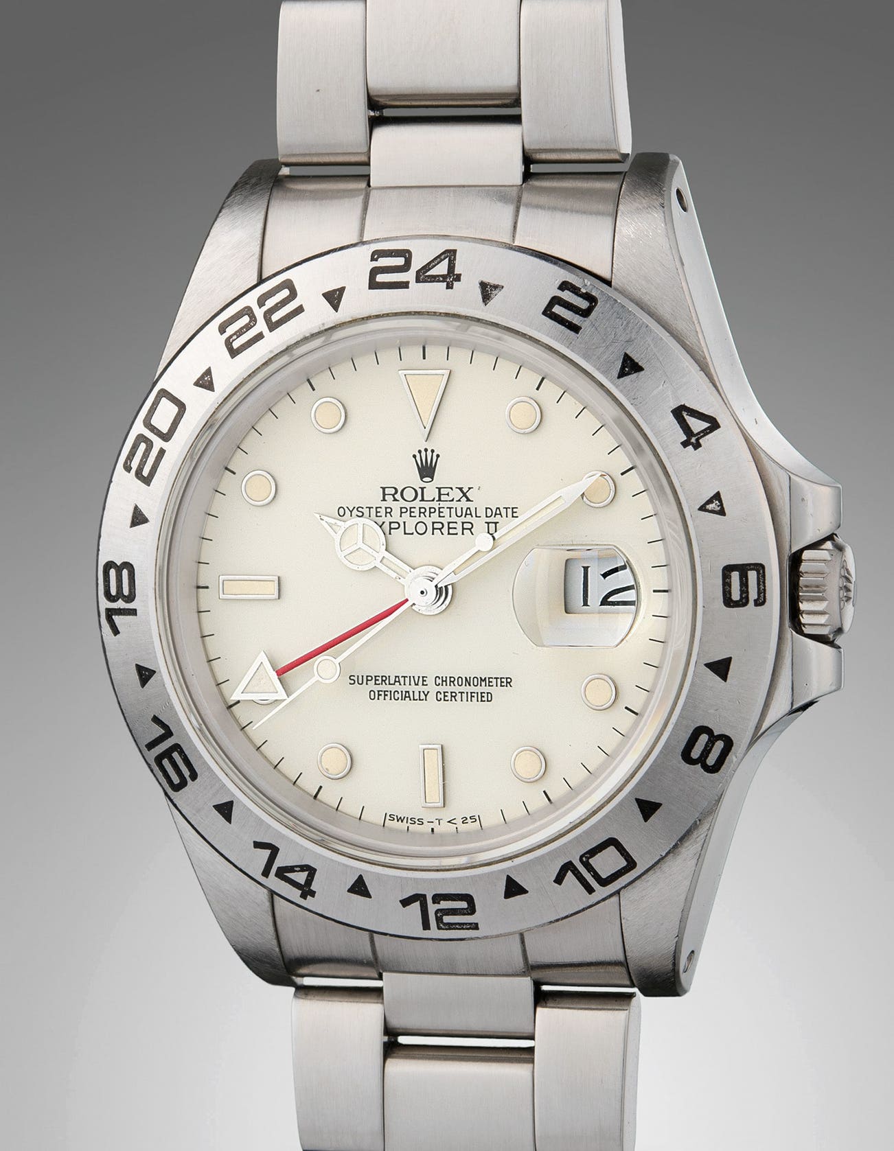 Launched in 1985, the Rolex Explorer II reference 16550 was the first Explorer II model to be fitted with a scratch-resistant sapphire crystal. Only in production for less than a handful of years, it has become a favorite amongst collectors of Rolex sport watches. Due to a flaw in the paint used in the reference’s earliest dials, watches fitted with originally white dials are often seen with tones that have aged to pleasing shades of ivory or cream.