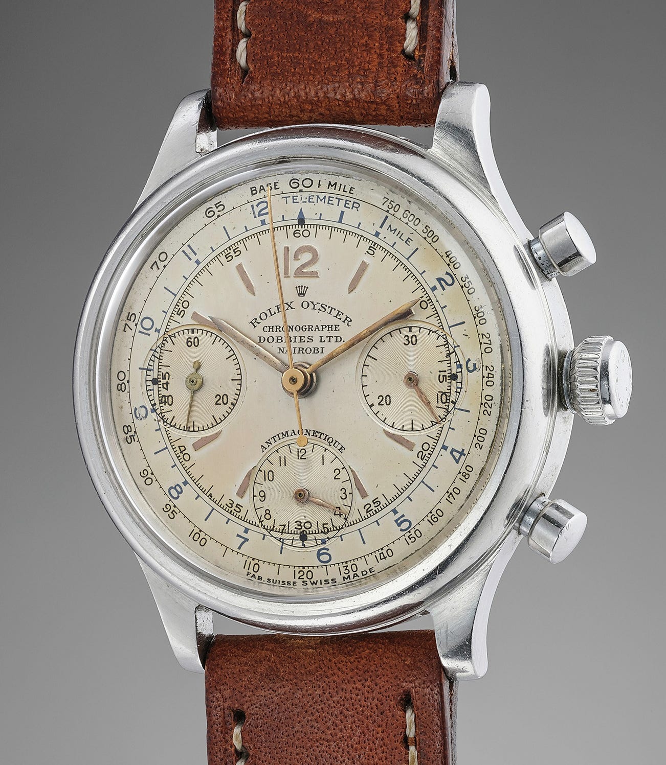 This watch most notably displays the signature "Dobbies Ltd." on the dial below 12 o'clock. A jeweler and watch retailer, Dobbies in Nairobi, Kenya has stamped its name on a highly limited number of watches, making the present example extremely rare.