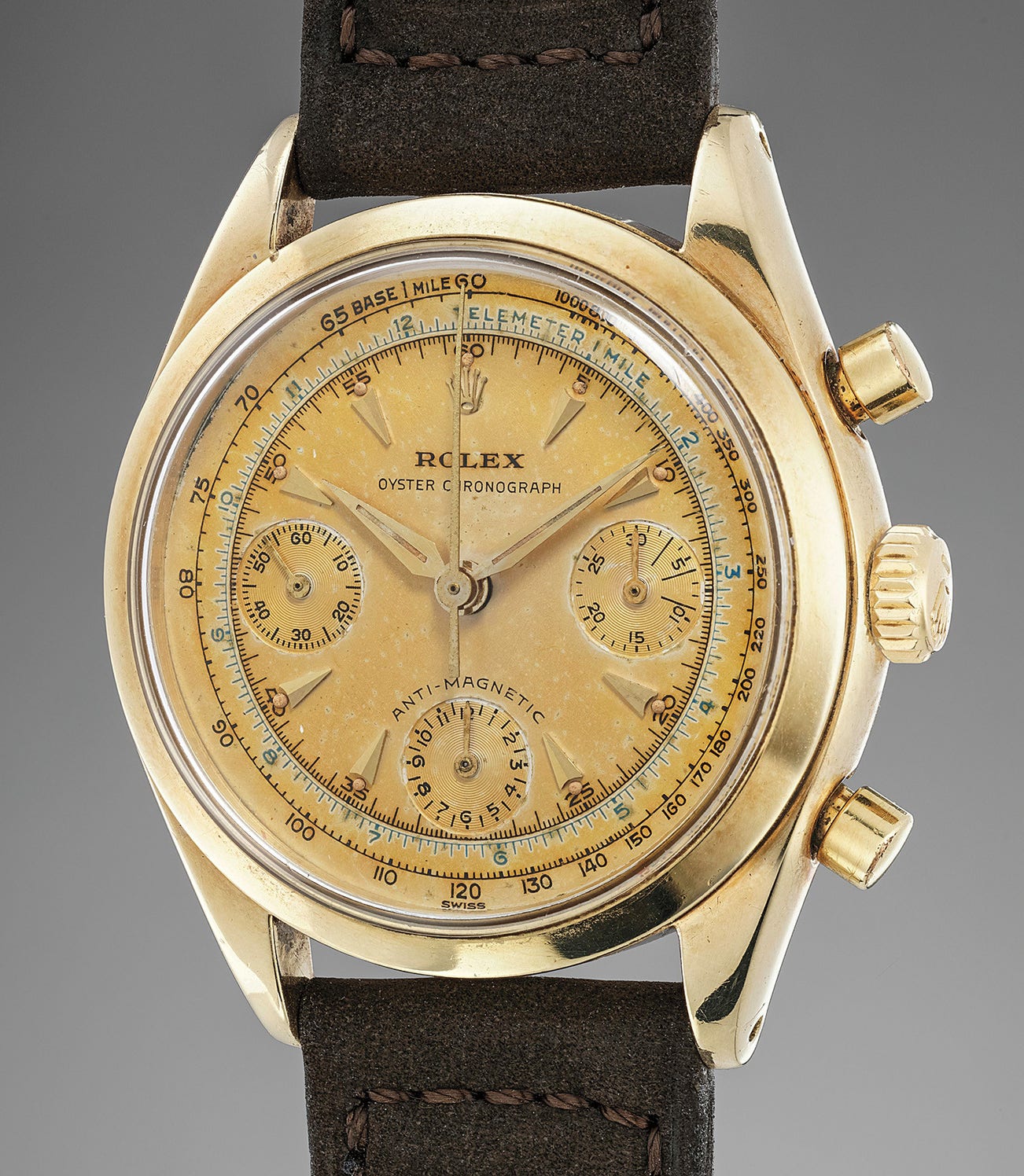 Vintage watch collectors love to half-jokingly point out how each vintage piece is unique: the passage of time and the way the timepieces are employed have a different effect on each watch. Of course, most often the difference between pieces is simply a slightly more patinated dial, or a different aging of the numerals. Sometimes, however, the magic operated by time on a watch is truly able to transfigure the item into something virtually unique and absolutely breathtaking. Such is the case of the present example of reference 6034. The dial has acquired a mystifying champagne hue which undeniably places the present piece well apart from the other representatives of the reference. Furthermore, the tropicalization process did not have any impact whatsoever on the graphics which are perfectly preserved, most notably the blue telemeter scale. In fact, the blue ink is still absolutely vibrant, and the champagne patina does not touch the scale, leaving a sort of bright halo around it which further emphasizes the colored scale.