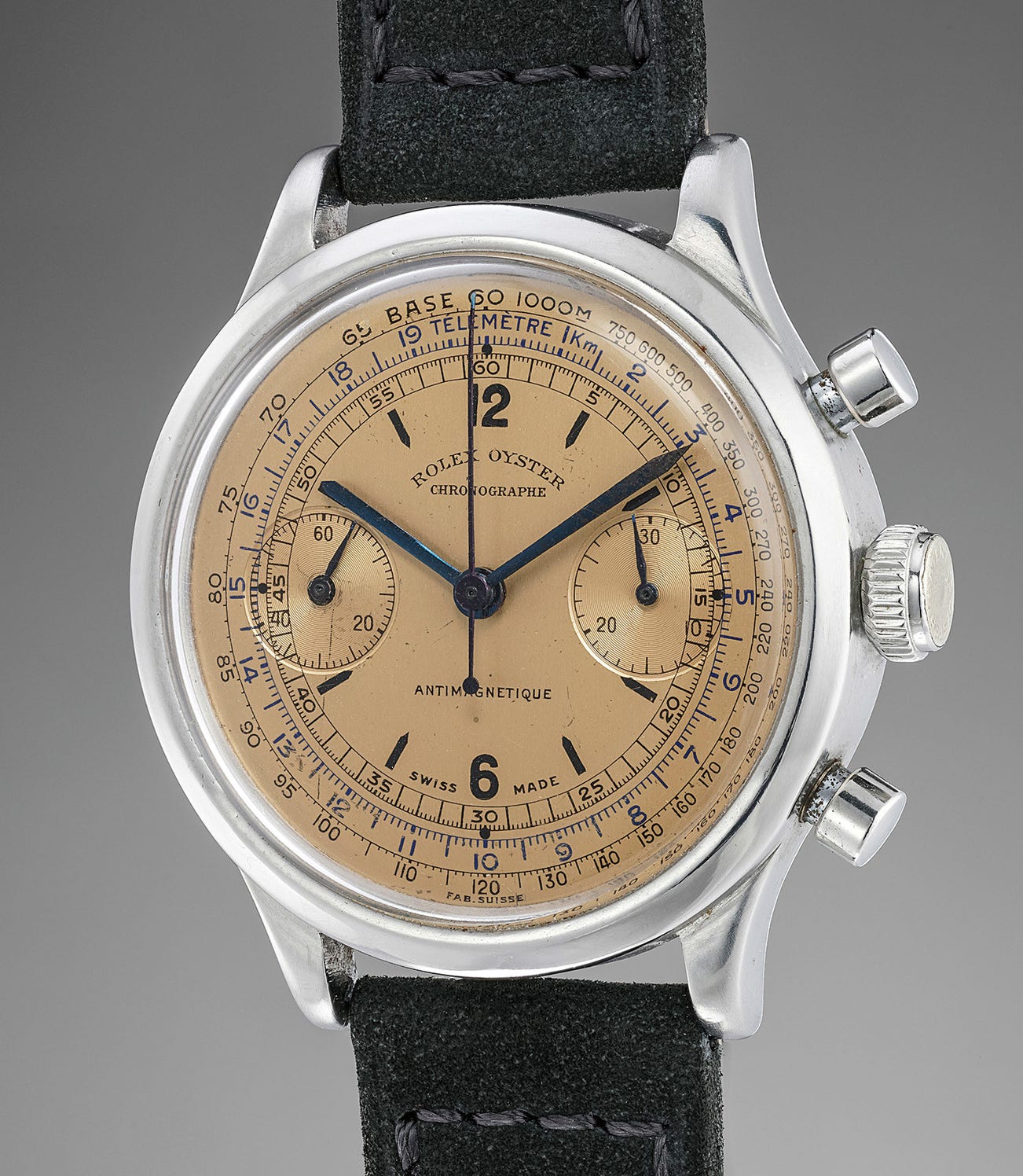 An extremely rare and highly attractive stainless steel chronograph wristwatch with salmon dial, tachymeter and telemeter scales