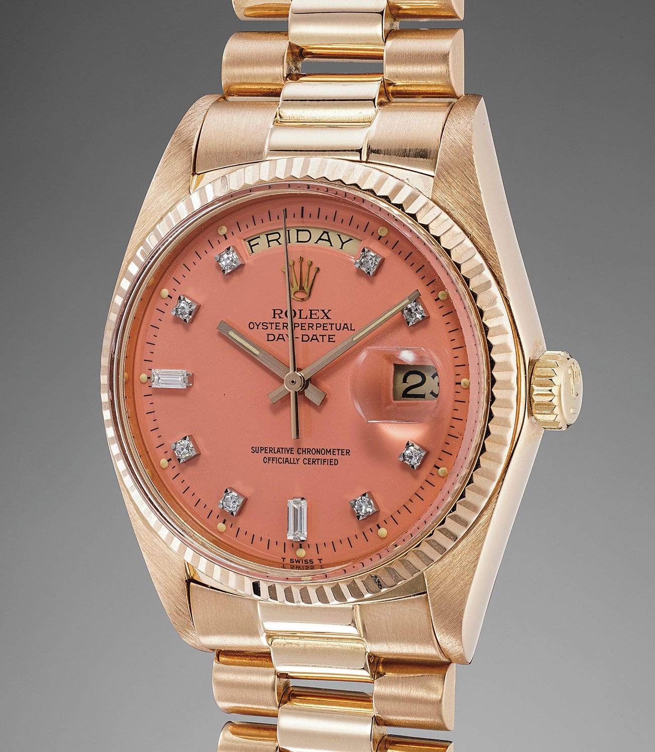 In superb condition, the pink gold case of the present model displays strong hallmarks on the underside of the lugs, the proportions are robust, and the top of the lugs feature sharp finishes. The flamingo pink dial, set with diamond hour markers, is vibrant and retains its high glossy finish.