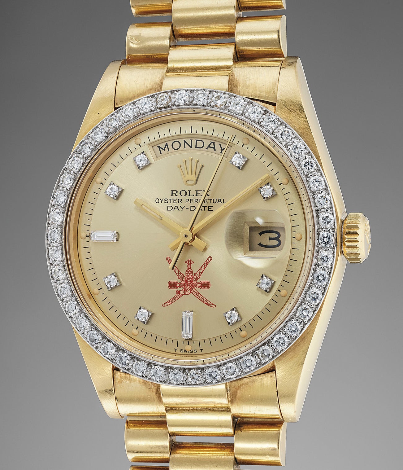 As the most versatile of all Rolexes, the model exists in thousands of configurations. The present Day-Date was a special order from his Majesty Qaboos bin Said al Said. An avid watch collector himself, the Sultan of Oman commissioned Rolex in the early 1970s and asked the company to present him with watches adorned by his emblem so he could gift them to people he wanted to reward with an important and personal present. These watches were therefore never available to the public and were a distinction that only a few could enjoy. In well-preserved condition, this watch, from 1977, displays the red Omani “Khanjar” and a superb diamond-set bezel that perfectly complements the yellow gold dial with round-cut and baguette-cut diamond numerals. Today, the Day-Date holds a special place in almost every watch collection and is rightfully called an icon. “Khanjar” Day-Dates are the rarest and most unusual and are sure to attract the most discerning collectors.