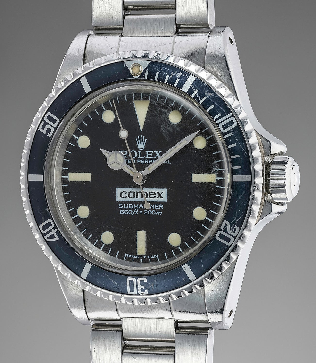 The COMEX engraving to the caseback of these pieces is known in two different variations: early versions feature COMEX across the caseback, while later pieces such as the present one instead feature it around the back, close to the rim. Furthermore, three different sizes are known to have been used for the number font.