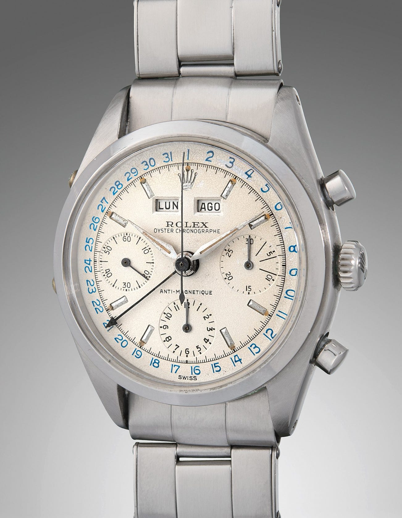 The present example is very well-preserved with a beautiful and original dial highlighted by the outer blue calendar ring with closed 6 and 9 numerals and embossed Rolex crown at the 12 position. The double faceted, polished numerals embossed in relief have aged nicely through the years with the luminous hour markers and hands aging to a lovely light brownish hue. Today’s collectors are seeking timepieces that not only define their collection, but help establish the historical timeline of a brand. A "Jean-Claude Killy" is an important step in the evolution of any collection – a “must-have” trophy watch for discerning connoisseurs seeking to own one of the most prestigious and complicated watches ever made by Rolex.